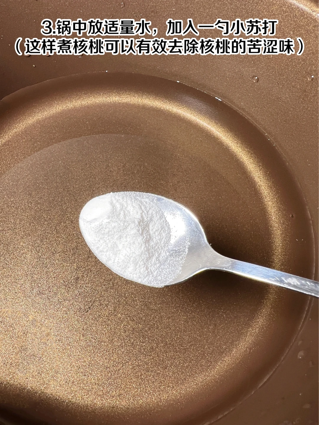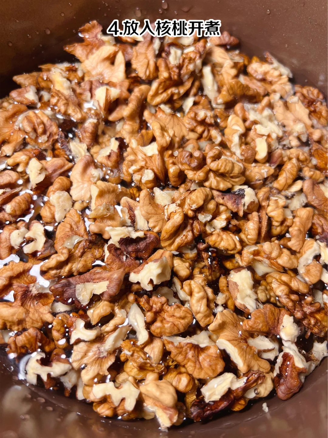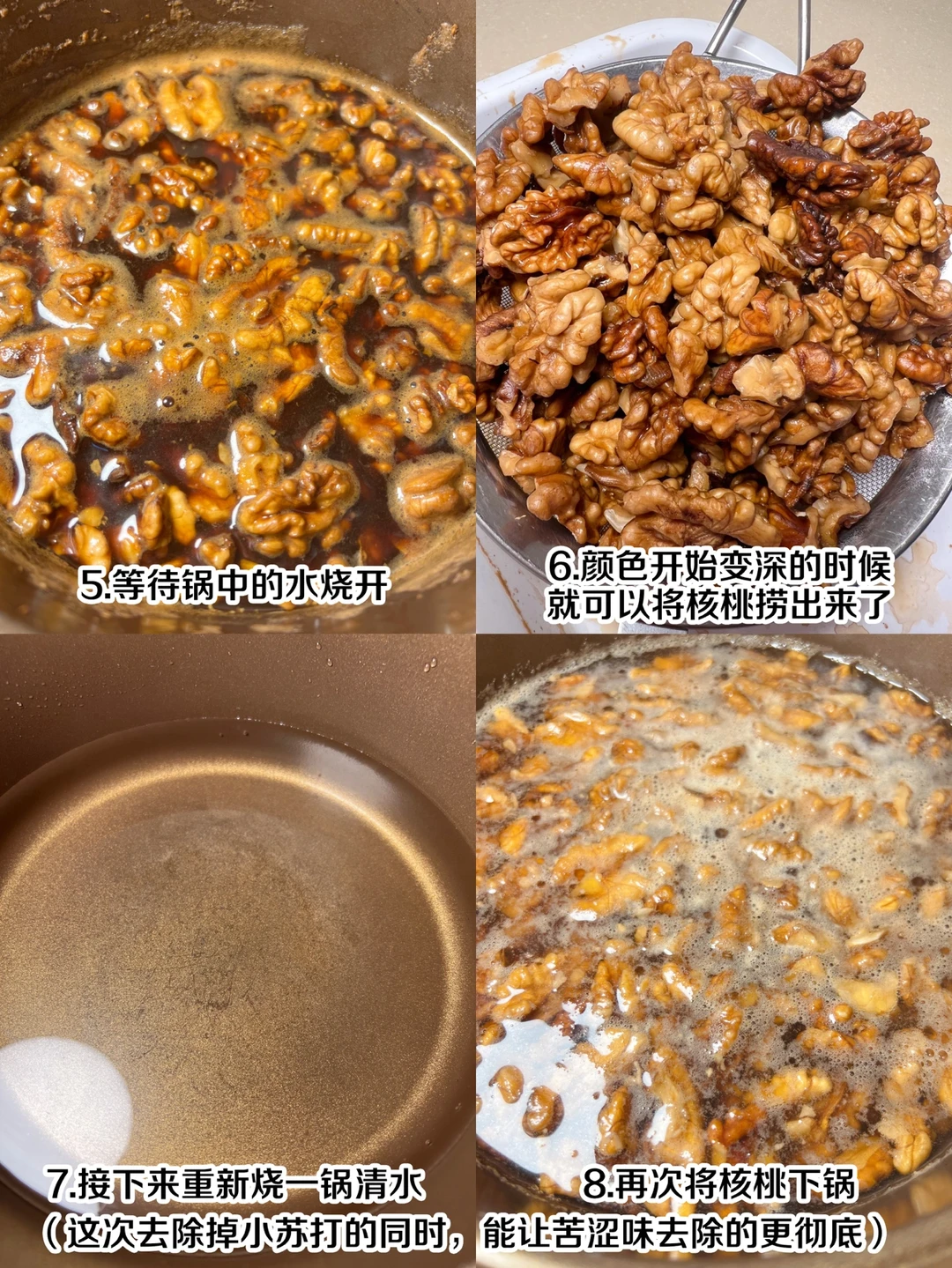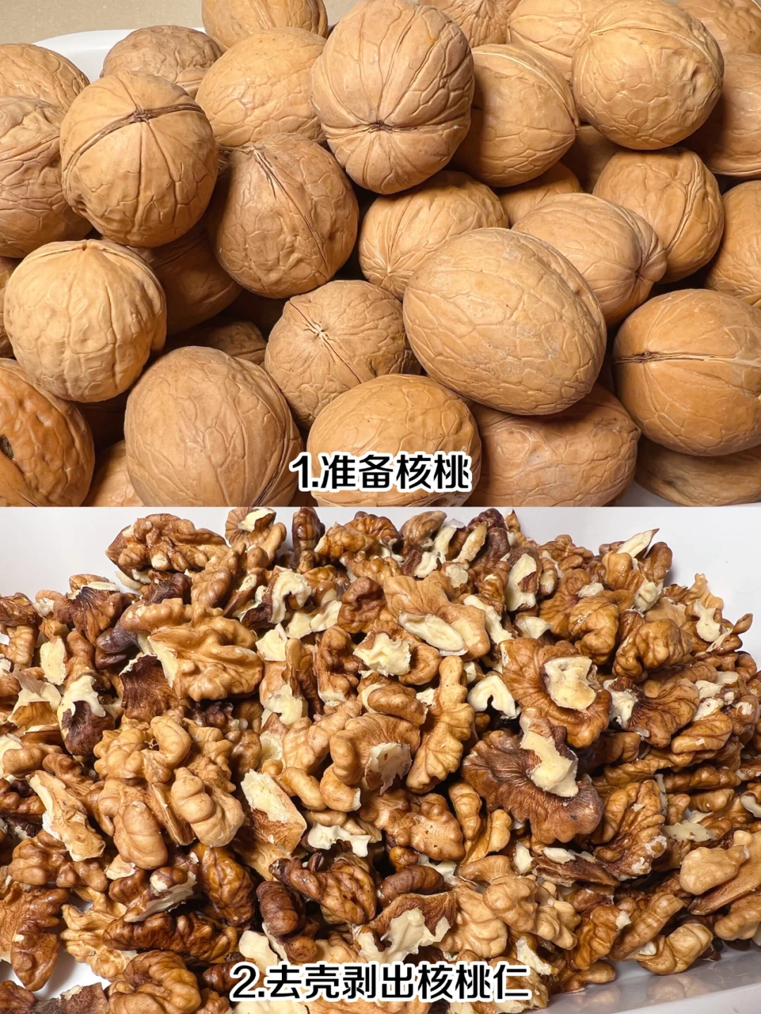 步骤 1、准备核桃 2、去壳剥出核桃仁 3、锅中放适量水,加入一勺小苏打(这样煮核桃可以有效去除核桃的苦涩味) 4、放入核桃开煮 5、等待锅中的水烧开,颜色开始变深的时候,就可以将核桃捞出来了 6、接下来重新烧一锅清水,再次将核桃下锅(这次去除掉小苏打的同时,能让苦涩味去除的更彻底) 7、核桃里加入两勺蜂蜜、两勺白糖、两勺芝麻,抓拌均匀 8、把核桃铺到油纸上 9、预热好的烤箱150度30分钟(也可用空气炸锅) 10、放凉后就可以吃啦,超级酥脆!👍