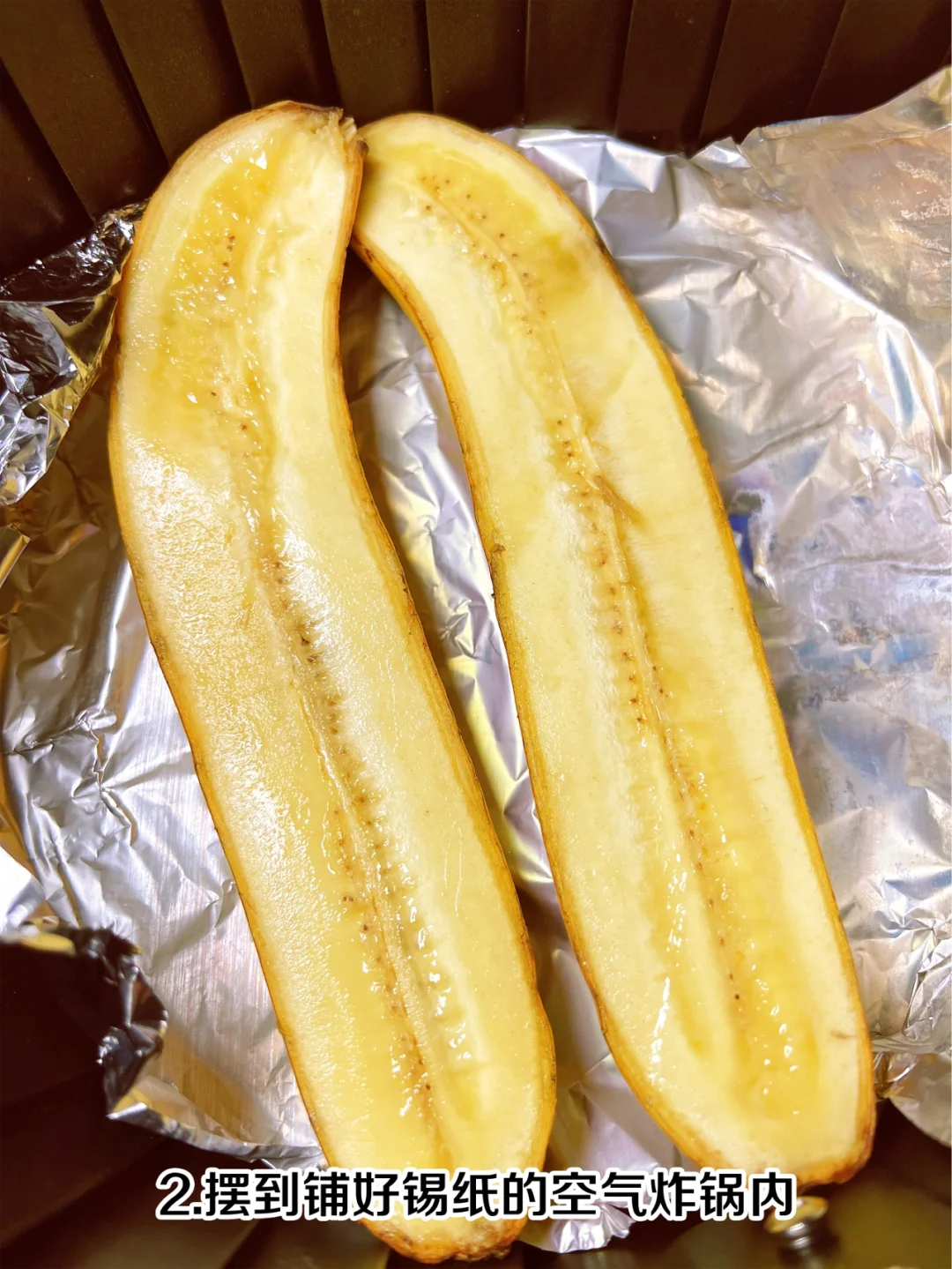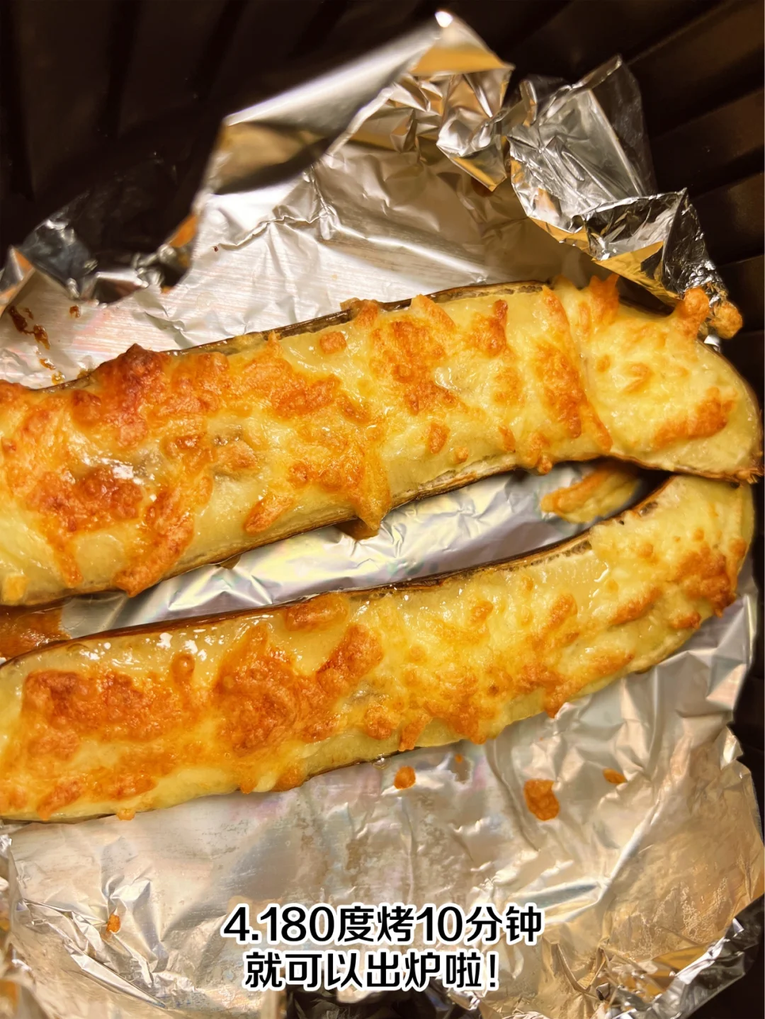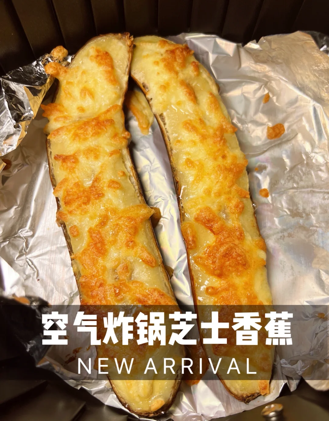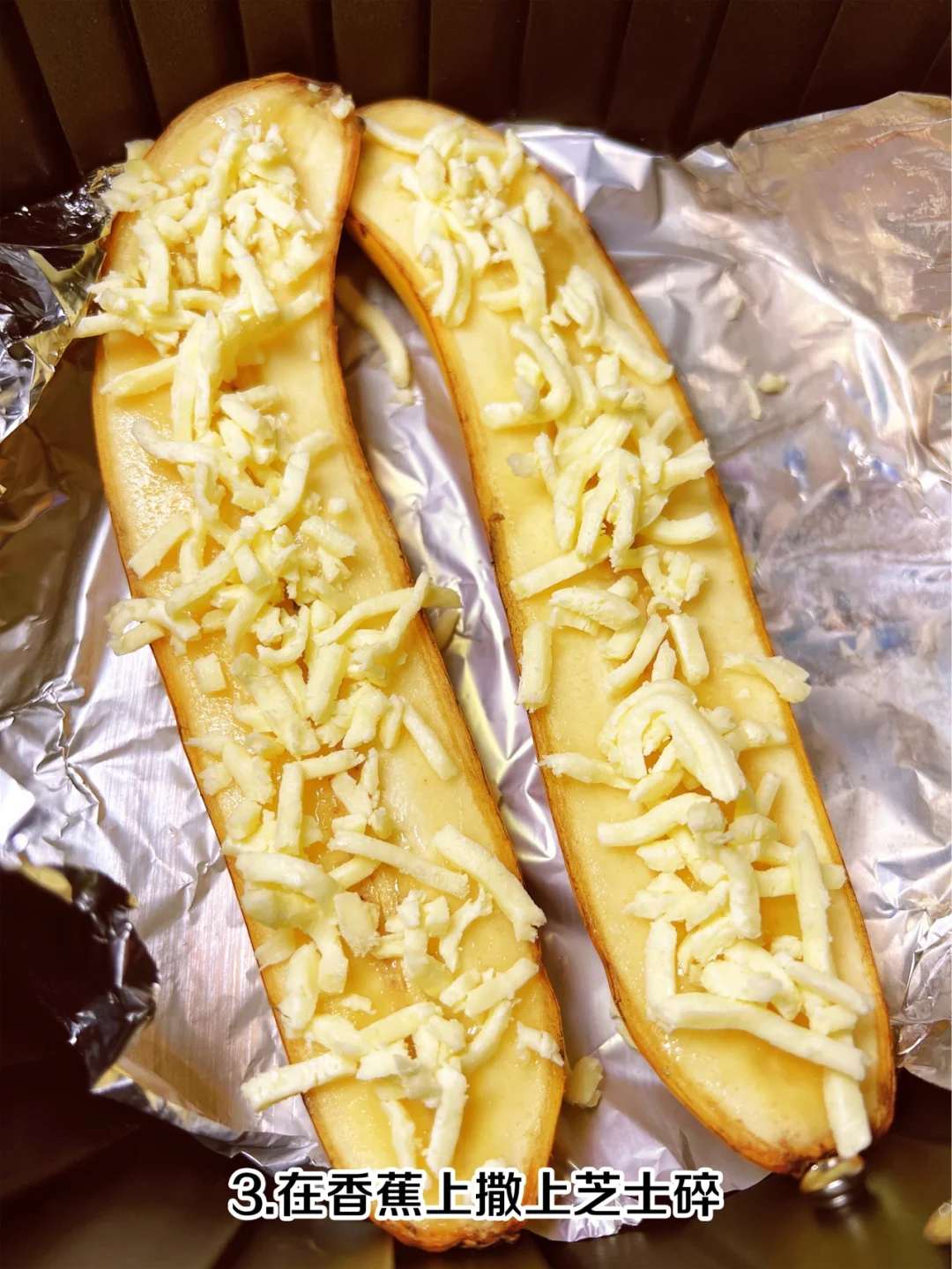 解锁香蕉新吃法,空气炸锅芝士香蕉🍌 步骤🌟 1、香蕉切成两半 2、摆到铺好锡纸的空气炸锅内 3、在香蕉上撒上芝士碎 4、180度烤10分钟就可以出炉啦 浓浓的芝士加上香蕉的软糯,味道超乎想象!👍
