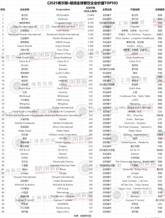 长沙晚报掌上长沙12月15日讯(全媒体记者曹开阳)12月15日,按照企业市值或估值进行排名,胡润研究院携手餐饮智能化解决方案提供商希尔斯联合发布《2025希尔斯·胡润全球餐饮企业价值TOP50》。这是胡润研究院第四次发布餐饮行业榜单,同时也是首次发布全球范围的餐饮企业价值榜单。