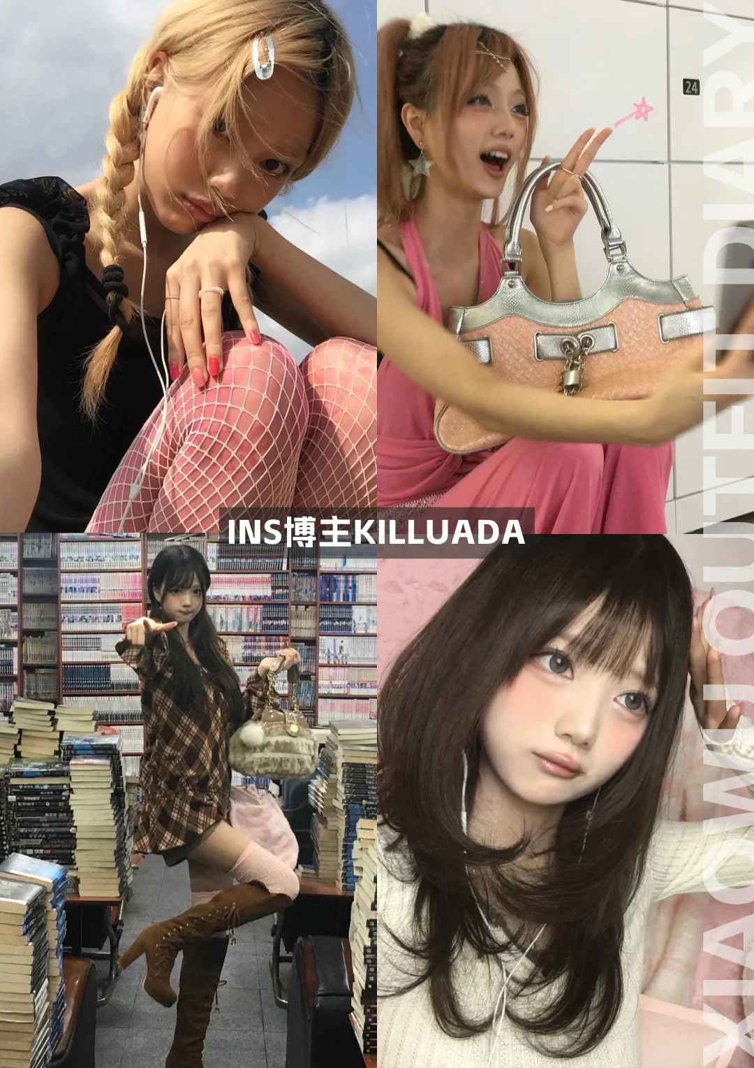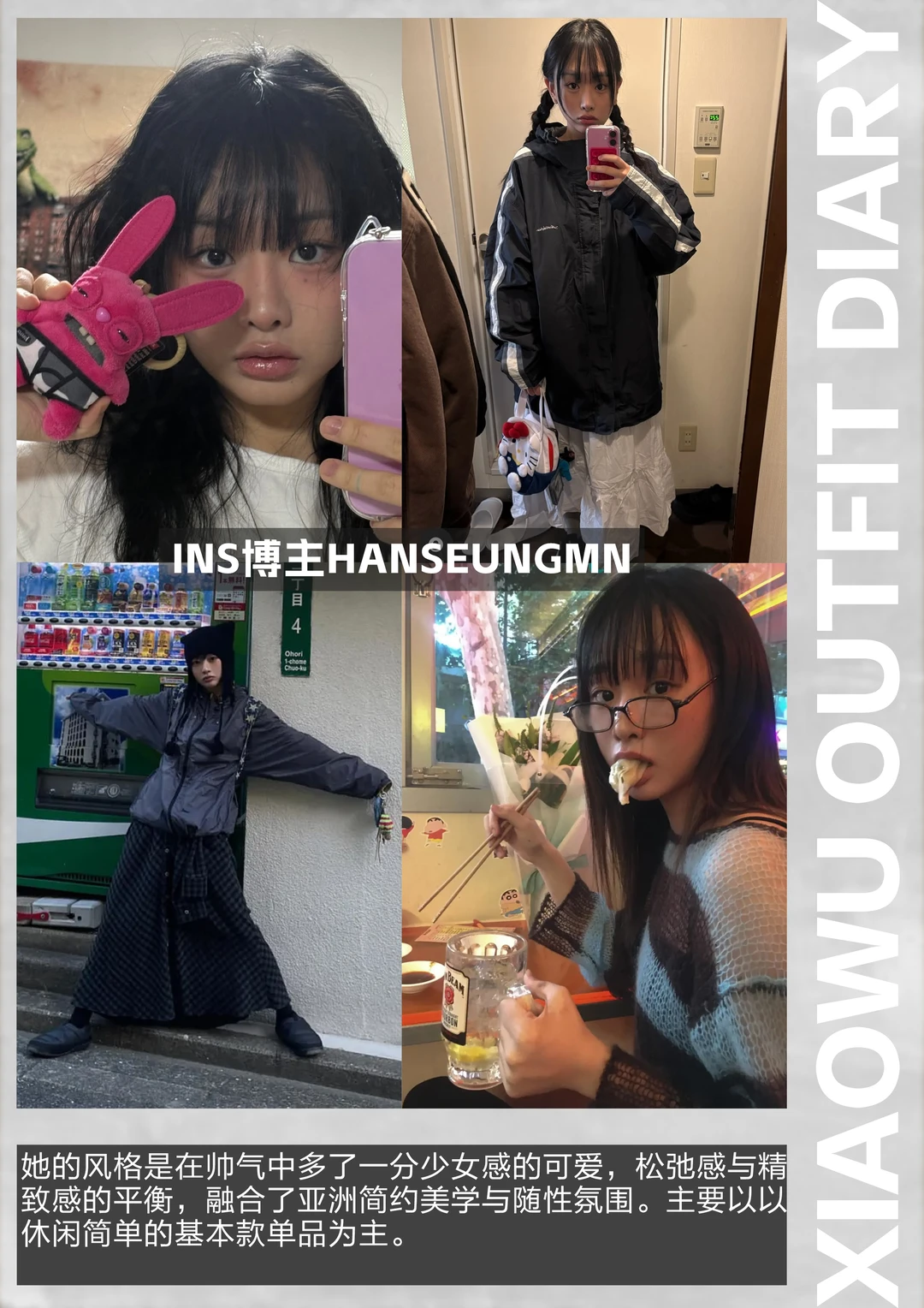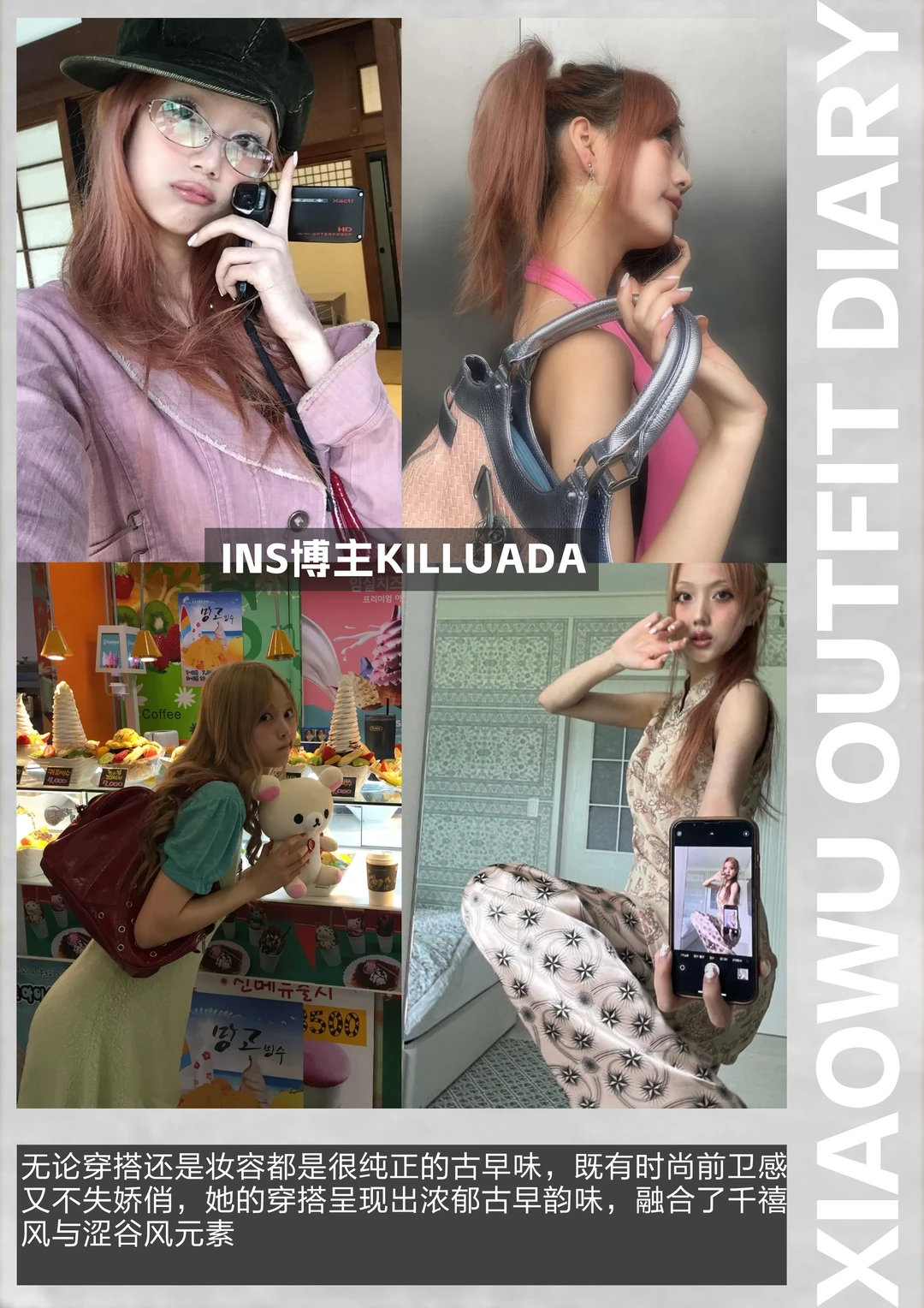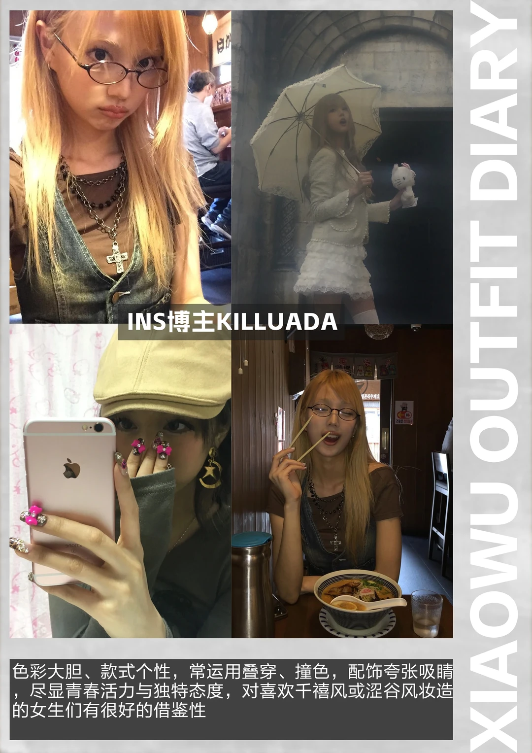 无论穿搭还是妆容都是很纯正的古早味,既有时尚前卫感又不失娇俏,她的穿搭呈现出浓郁古早韵味,融合了千禧风与涩谷风元素,色彩大胆、款式个性,常运用叠穿、撞色,配饰夸张吸睛,尽显青春活力与独特态度,对喜欢千禧风或涩谷风妆造的女生们有很好的借鉴性。