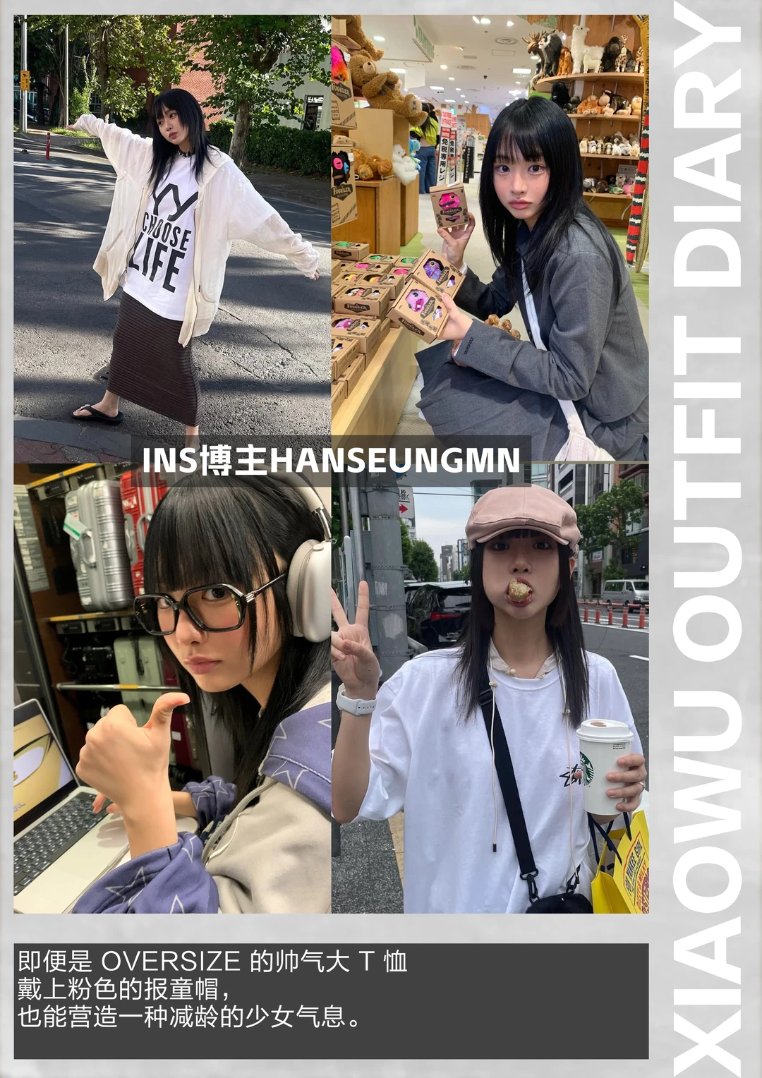 她的风格是在帅气中多了一分少女感的可爱,松弛感与精致感的平衡,融合了亚洲简约美学与随性氛围。主要以以休闲简单的基本款单品为主,即便是 Oversize 的帅气大 T 恤,戴上粉色的报童帽,也能营造一种减龄的少女气息。