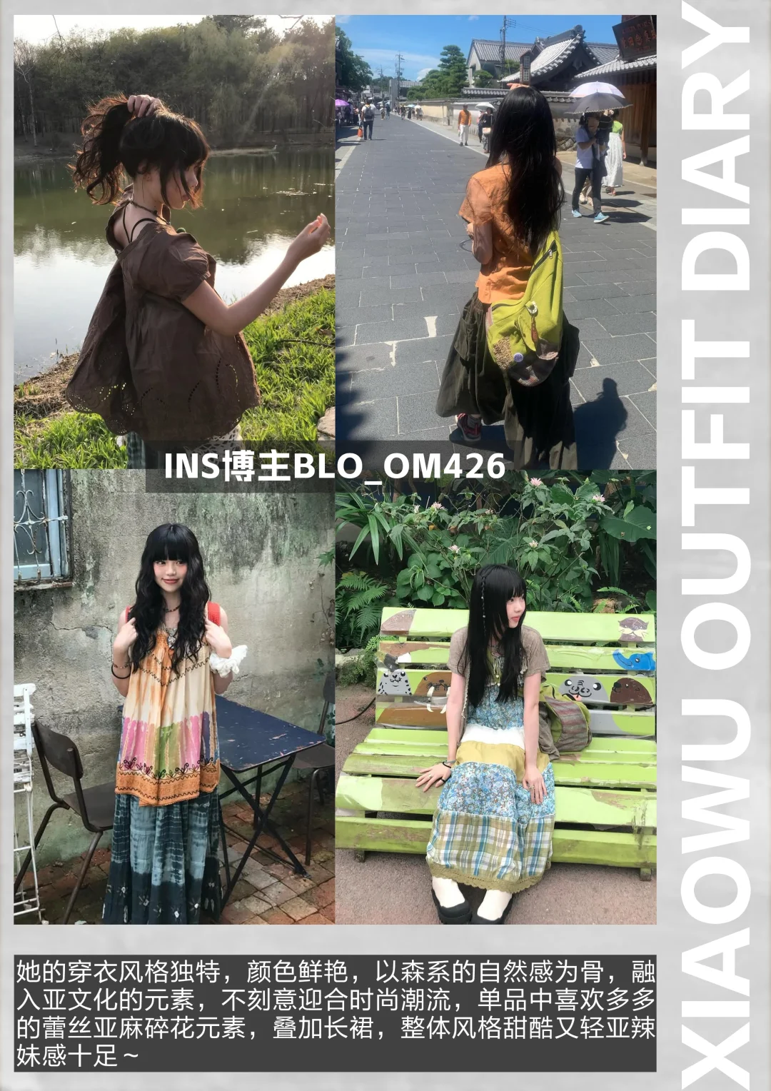 她的穿衣风格独特,颜色鲜艳,以森系的自然感为骨,融入亚文化的元素,不刻意迎合时尚潮流,单品中喜欢多多的蕾丝亚麻碎花元素,叠加长裙,整体风格甜酷又轻亚辣妹感十足~