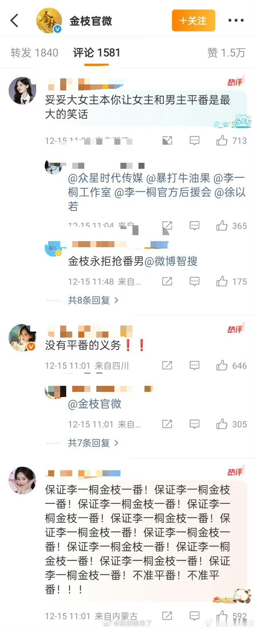 李一桐粉丝不满和陈星旭平番,跑去金枝官博转发评论区排字了