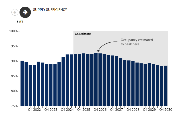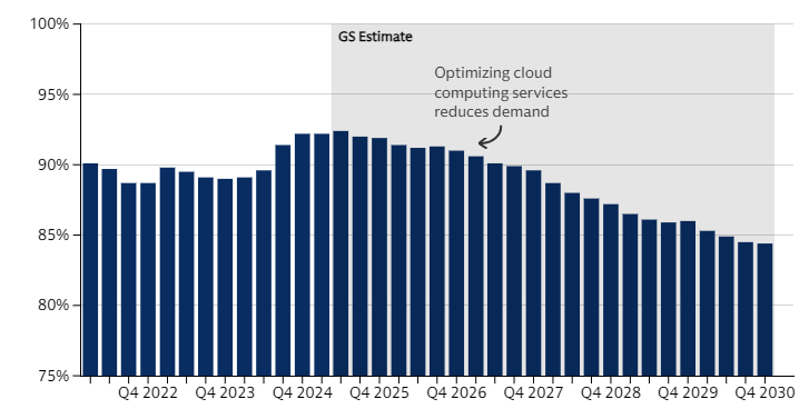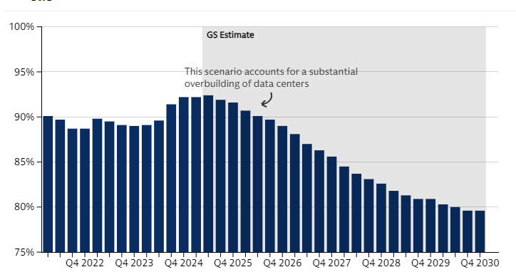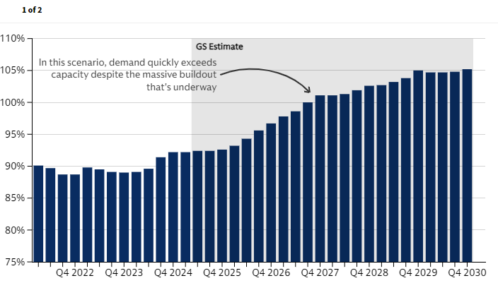 尽管2027年以后的前景尚不明朗,但高盛的分析师预计,此后数据中心资源的供应紧张局面将有所缓解,占用率将在2028年逐步回落至90%左右,然后趋于稳定。