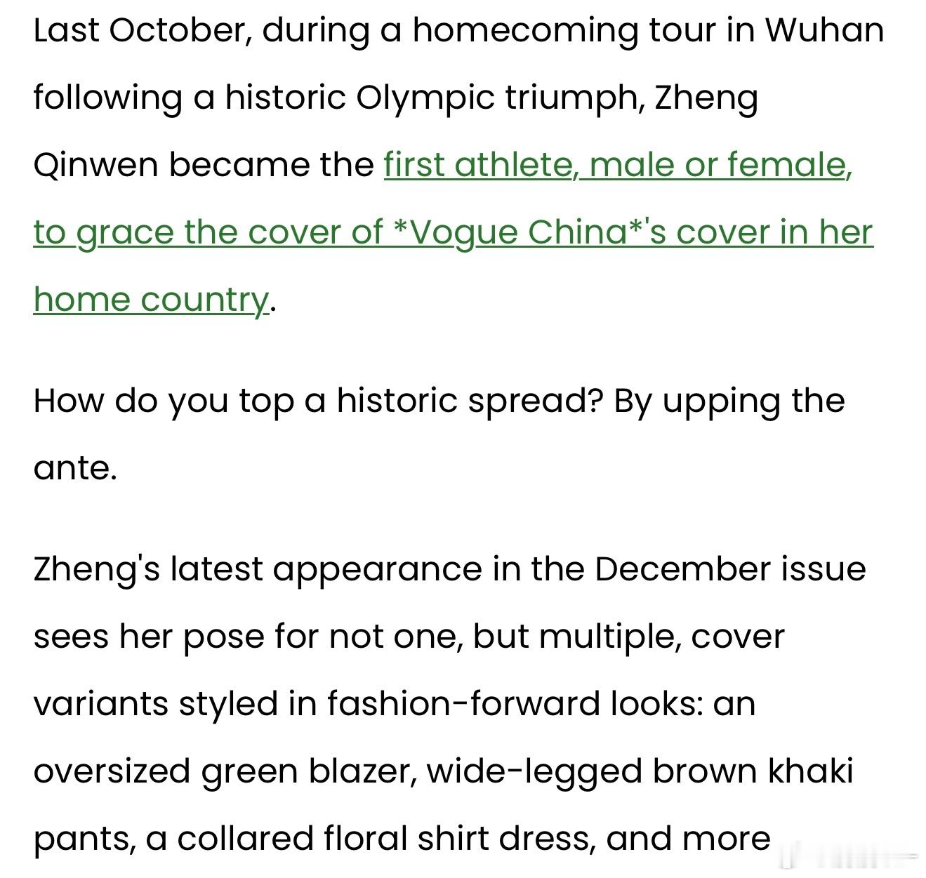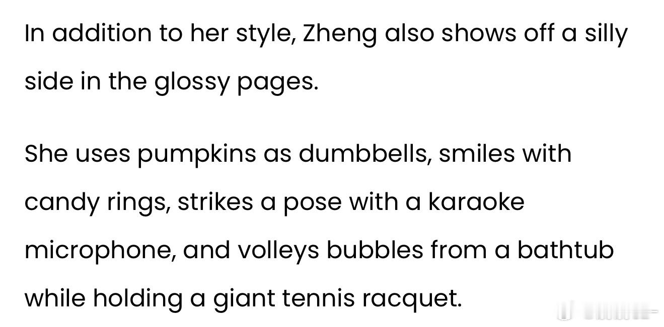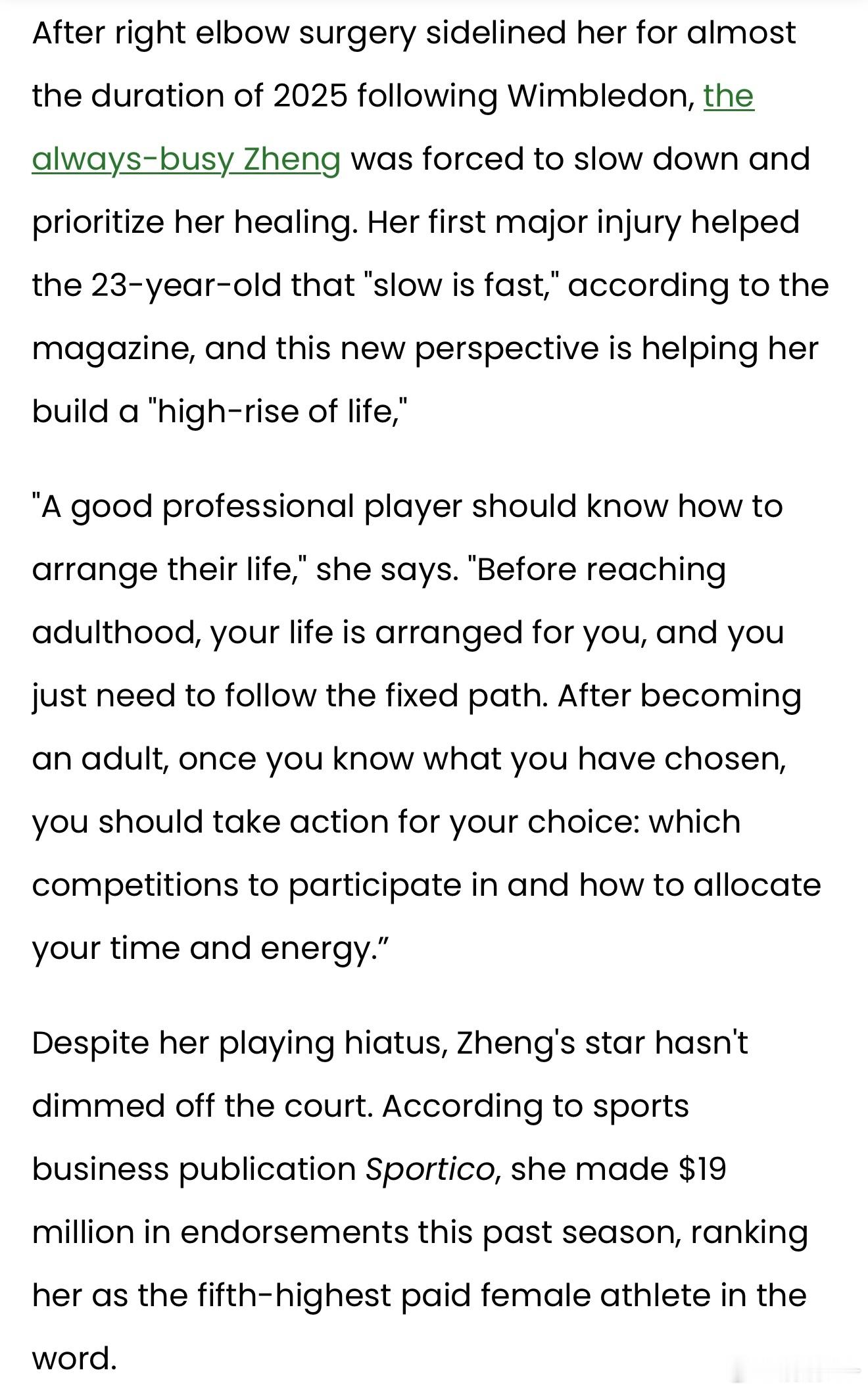 时尚高光时刻💫郑钦文亮相中国版《Vogue》十二月刊大片,诠释“自成节奏”的独特魅力尽管因右肘手术缺席了2025赛季的大半赛程,郑钦文的赛场外星光依旧璀璨。去年10月,郑钦文在斩获历史性奥运佳绩后回到家乡武汉开启巡游活动,她也由此成为首位登上中国版《Vogue》封面的中国男女运动员。如何超越这一具有里程碑意义的封面大片?答案是持续加码突破。在最新发布的12月刊中,郑钦文一人包揽多款封面造型,身着前卫时尚的穿搭出镜:oversize绿色西装外套、卡其色阔腿裤、印花翻领衬衫裙等风格各异的服饰悉数亮相。除了亮眼的穿搭造型,郑钦文还在这组质感大片里展露了俏皮可爱的一面。她把南瓜当作哑铃把玩,戴着糖果戒指咧嘴微笑,手持卡拉OK麦克风摆出击球般的姿势,甚至握着巨型网球拍,在浴缸里和飘起的泡泡玩起了“对打”。尽管镜头前满是奇趣灵动的画面,但在题为《自成节奏》的配套专访中,郑钦文却一改俏皮姿态,言谈间尽显沉稳认真。温网之后,右肘手术让始终忙碌的郑钦文在2025年的大部分时间里都处于休赛状态,她不得不放慢脚步,将康复放在首位。杂志报道称,这次职业生涯的首次重大伤病,让23岁的她领悟到“慢即是快”的道理,而这份新的人生感悟,正助力她搭建属于自己的“人生高楼”。“一名优秀的职业运动员,应当懂得规划自己的生活。”她说道,“成年之前,人生轨迹早已被安排好,你只需要循着既定的道路前行。成年之后,一旦明确了自己的选择,就要为这份选择付诸行动:决定参加哪些赛事,规划好时间与精力的分配。”尽管暂别赛场,郑钦文的场外人气依旧不减。据体育商业媒体《体育商业日报》统计,她在上一赛季斩获了1900万美元的代言收入,跻身全球收入最高女运动员榜单第五位。体育大赏年度体育榜样力量郑钦文第二次登vogue封面
