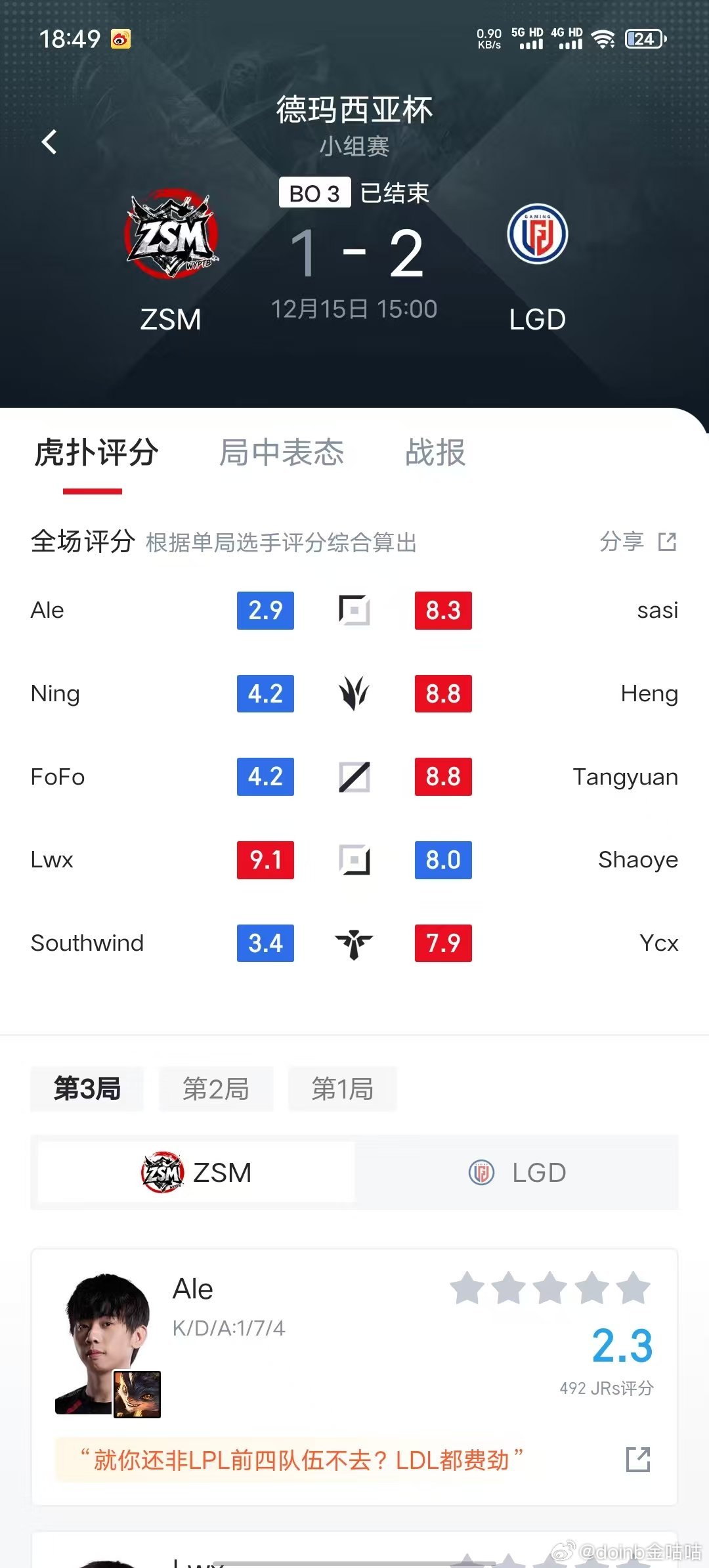虎扑12月15日讯Doinb分享虎扑评分关于Lwx9.1的分数: