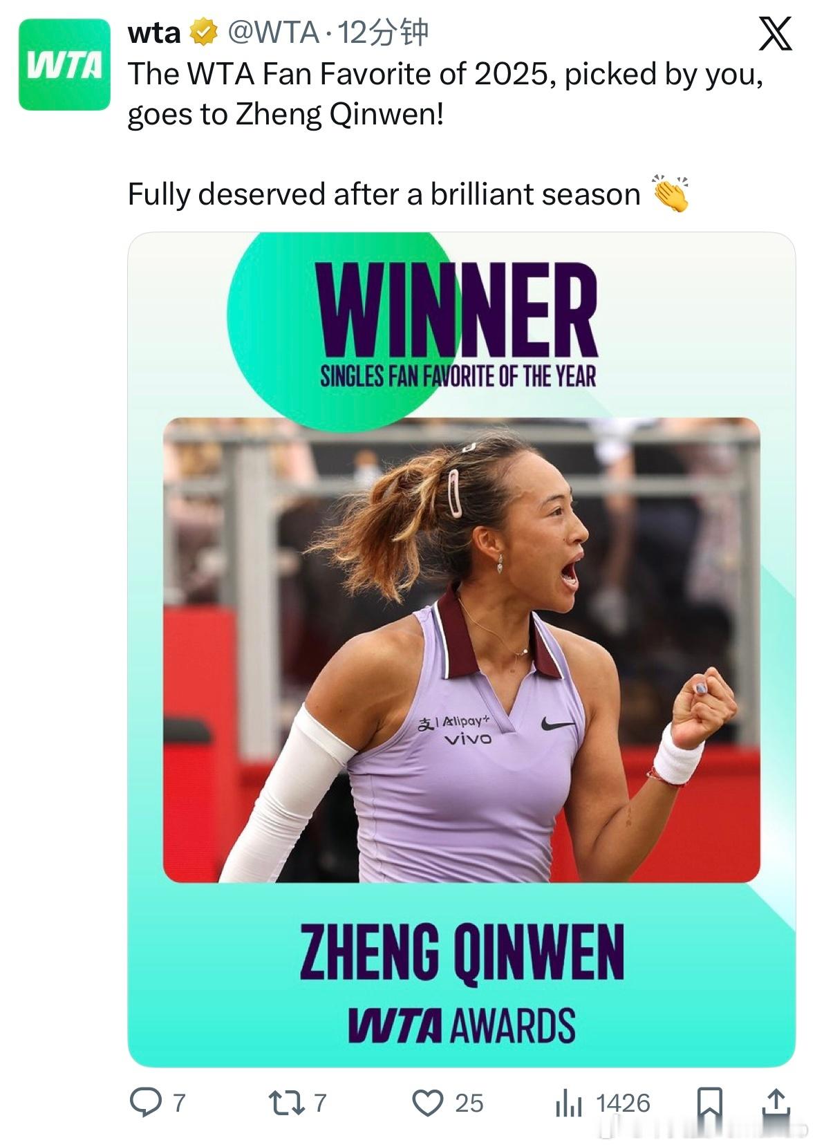 郑钦文蝉联WTA最受欢迎单打球员郑钦文!!!2025赛季WTA年度最受欢迎球员W