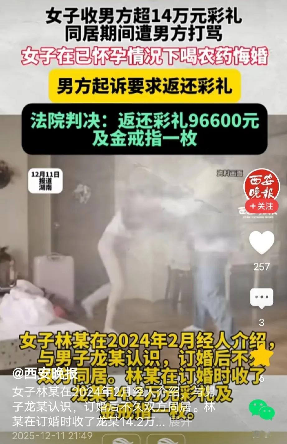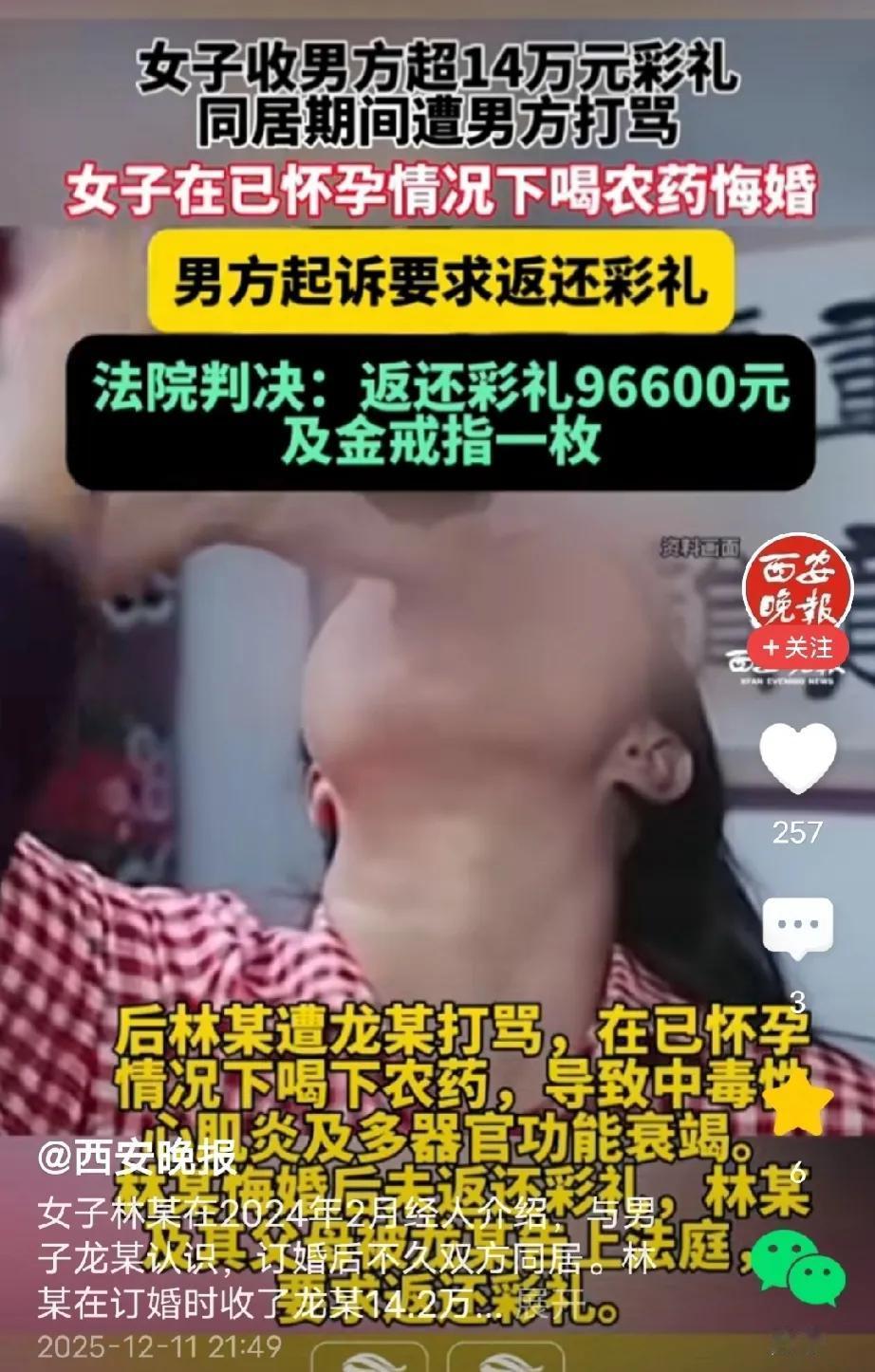 湖南湘阴,男子跟女友订婚给了14.2万彩礼,两人同居男子才发现,女友有恋爱史,动手打了她,这样还不解气,女友怀孕后,男子一想到她有恋爱经历,又用手掐她脖子,女子不堪忍受,喝下农药,导致中毒性心肌炎、多器官功能衰竭。出院后,女子悔婚,男子要求她退还全部彩礼,女子不乐意,被男子告上法庭要求全部退还彩礼,最终,法院判了。 林女士曾经谈过一个男朋友,两人还同居了一段期间,但是因为种种原因,最终没能修成正果。 跟前男友分手后,林女士消沉了很长一段时间,之后才慢慢地从上一段感情中走出来。 2024年2月份,林女士经人介绍,认识龙先生,龙先生家境不错,为人初看也能合得来,应该是过日子的人。 林女士很快就跟龙先生确定了恋爱关系,两人交往了半年左右,决定把事情定下来。 2024年7月15日,林女士和龙先生按照当地习俗在老家举办了订婚仪式。 订婚当天,龙先生家人了林女士家14.2万的彩礼,另外还有一枚金戒指。 虽然两人没有领证结婚,但是办了订婚宴后,两人在大家看来也算是夫妻了。 林女士顺理成章地搬到龙先生家,两人正式同居生活到一起。 龙先生一直以为自己花了14万多娶回来一个纯洁、只属于自己的女人,可他跟林女士在一起后才知道她竟然有过恋爱经历。 这个消息有如五雷轰顶,他觉得自己很憋屈,他质问林女士为什么订婚之前没有告诉他。 林女士觉得很无辜,都这个年代了,龙先生还这么在意这个,试问,这个年纪了谁还没有过一两段恋爱经历,她觉得很正常,再说了,龙先生也没有问过她。 两人因为这个事吵了起来,龙先生忍不住动手打了林女士,林女士觉得很委屈,她又不是跟了龙先生后还和别人恋爱,那都是过去的事。 龙先生看林女士还敢顶嘴,更加生气,从那之后,对林女士也没有那么上心和用心了。 两个月后的一天,林女士发现自己的例假迟迟不来,她买来验孕棒一测,才知道自己怀孕了。 林女士以为,有了宝宝后,龙先生对她的看法会有所改变,但当林女士把这个消息告诉龙先生,他却没有她意料的那么高兴。 反而,两人说着说着龙先生又把林女士有过恋爱经历的过往史翻出来,两人为此又大吵一架。 龙先生冲动之下打了林女士,林女士反抗后,他又用手掐林女士的脖子。 林女士心灰意冷,别说自己没怀孕,如今有了孩子,龙先生依然没改变,她对这段感情已经不抱任何希望。 越想越难过的林女士喝下了农药,被发现送医后,经医生检查诊断,农药导致林女士中毒性心肌炎,多器官衰竭。 林女士出院后,龙先生愿意不计前嫌,想跟林女士终归于好,到林女士下定决心,不再跟龙先生在一起,她要悔婚。 龙先生见林女士去意已决,知道无法挽回,要求林女士把彩礼全部退还,林女士拒绝了。 龙先生气不过把林女士和她父母告上法庭。 法庭上龙先生辩称,两人原本有婚约,出了这个事后,我本想和好,但林某态度冷淡,导致两人结不了婚。 龙某觉得自己结婚的目的没法实现,还被伤了感情,所以要求林某及家人返还14.2万元彩礼和订婚金戒指。 林某对此不认账,她觉得彩礼是给她个人的,告她父母没道理;还说订婚后两人就同居了,自己还怀了孕,龙某不仅骂她,还动手打骂、掐她脖子。 她受不了才喝农药自杀,虽然捡回一条命,但落下了中毒性心肌炎、多器官功能衰竭的毛病,孩子也没保住。 法院审理认为,12.8万彩礼钱、1万礼金、价值4098元的金戒指,因为两人没登记结婚,按法律林某该退彩礼。 但考虑到两人同居怀孕、林某因矛盾喝农药终止妊娠的情况,法院最终判林某返还70%的彩礼,也就是96600元。 格局《最高人民法院关于适用〈民法典〉婚姻家庭编的解释(一)》第5条规定,当事人请求返还按照习俗给付的彩礼的,如果查明属于以下情形,人民法院应当予以支持:(一)双方未办理结婚登记手续。 本案中,龙某与林某仅举办订婚仪式未办理结婚登记,符合该条款规定的彩礼返还基础条件。 这是法院支持返还彩礼的核心依据,也明确了彩礼作为附结婚条件赠与的法律性质,结婚目的未实现时男方有权主张返还。 另外,《最高人民法院关于审理涉彩礼纠纷案件适用法律若干问题的规定》第6条,双方未办理结婚登记但已共同生活,一方请求返还按照习俗给付的彩礼的,人民法院应当根据彩礼实际使用及嫁妆情况,综合考虑共同生活及孕育情况、双方过错等事实,结合当地习俗,确定是否返还以及返还的具体比例。 本案中,两人订婚后已实际同居且林某曾怀孕,后因龙某的暴力行为导致林某喝农药、终止妊娠。 龙某对婚约解除存在明显过错,林某也因该事件遭受身体伤害,法院据此综合考量,未支持全部返还,酌情判定返还70%彩礼,既符合法律规定,也兼顾了公平原则。 最后,龙先生的偏执与暴力是这场悲剧的导火索,既不尊重伴侣的过往,又用极端行为伤害对方,最终自食恶果;林女士的遭遇令人惋惜,婚姻的基础是尊重与包容,而非偏执的占有。