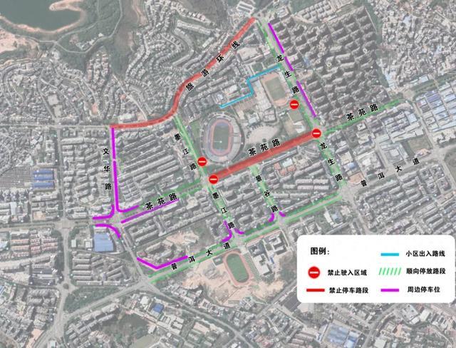 2、车辆停车管理。允许观赛人员车辆在上图中绿色标识路段:墨江路、景谷路、龙生路、普洱大道、茶苑路顺向有序停放。