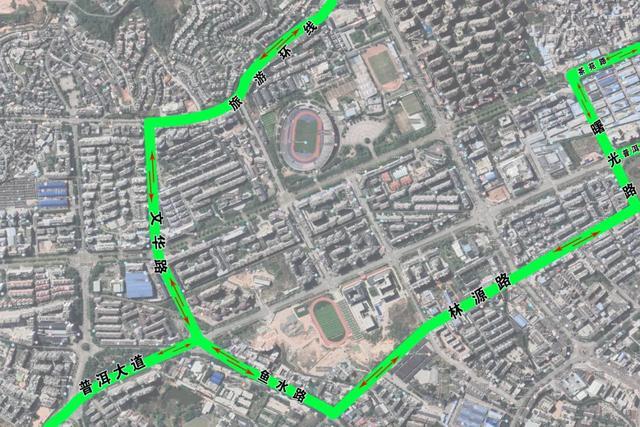 路线2:普洱大道↔鱼水路↔林源路↔曙光路↔茶苑路↔普洱南收费站
