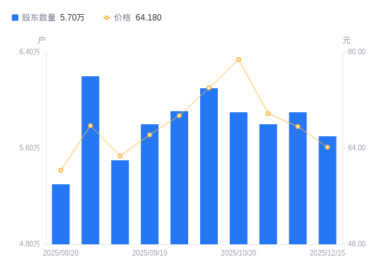 日期A股户数(户)流通A股户均持股数(股)户均持股市值(万元)2025-12-15570009511.2961.042025-11-10590009188.8762.142025-10-31580009347.3065.232025-10-20590009188.8772.402025-10-10610008887.6065.812025-09-30590869175.5063.712025-09-19580009347.3861.922025-09-10550009857.2361.832025-08-29620008744.3259.262025-08-205300010229.2061.72
