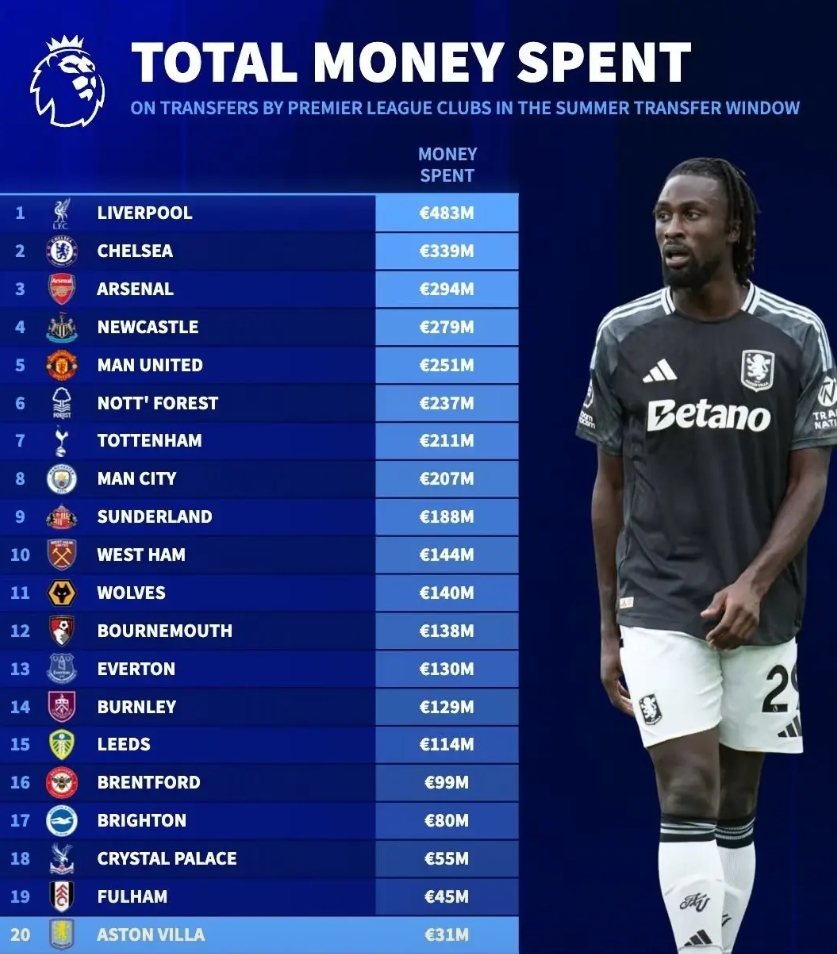 赛季前:利物浦英超投入最多——4.83亿欧,球迷惊呼“英超大结局”;维拉投入最少——3100万欧,放走17名球员!