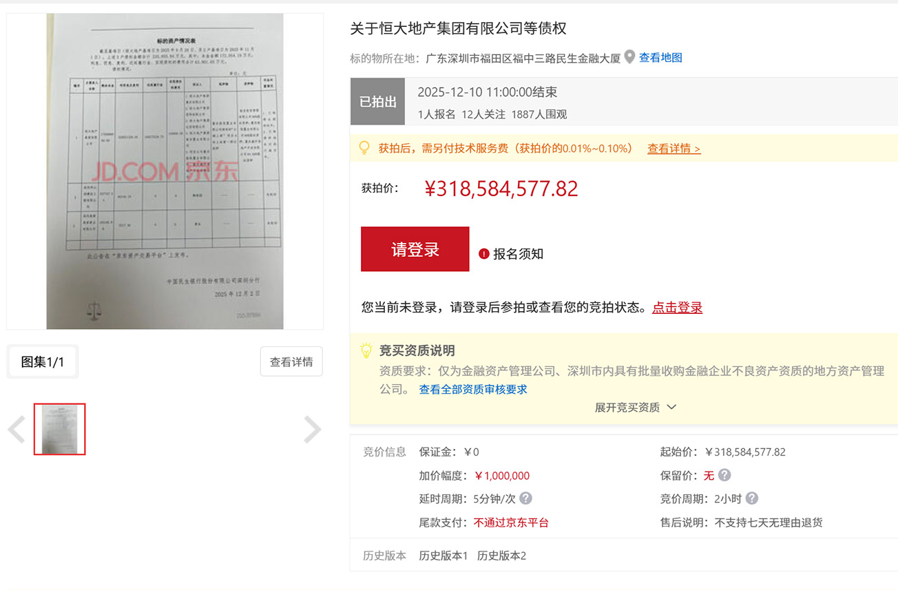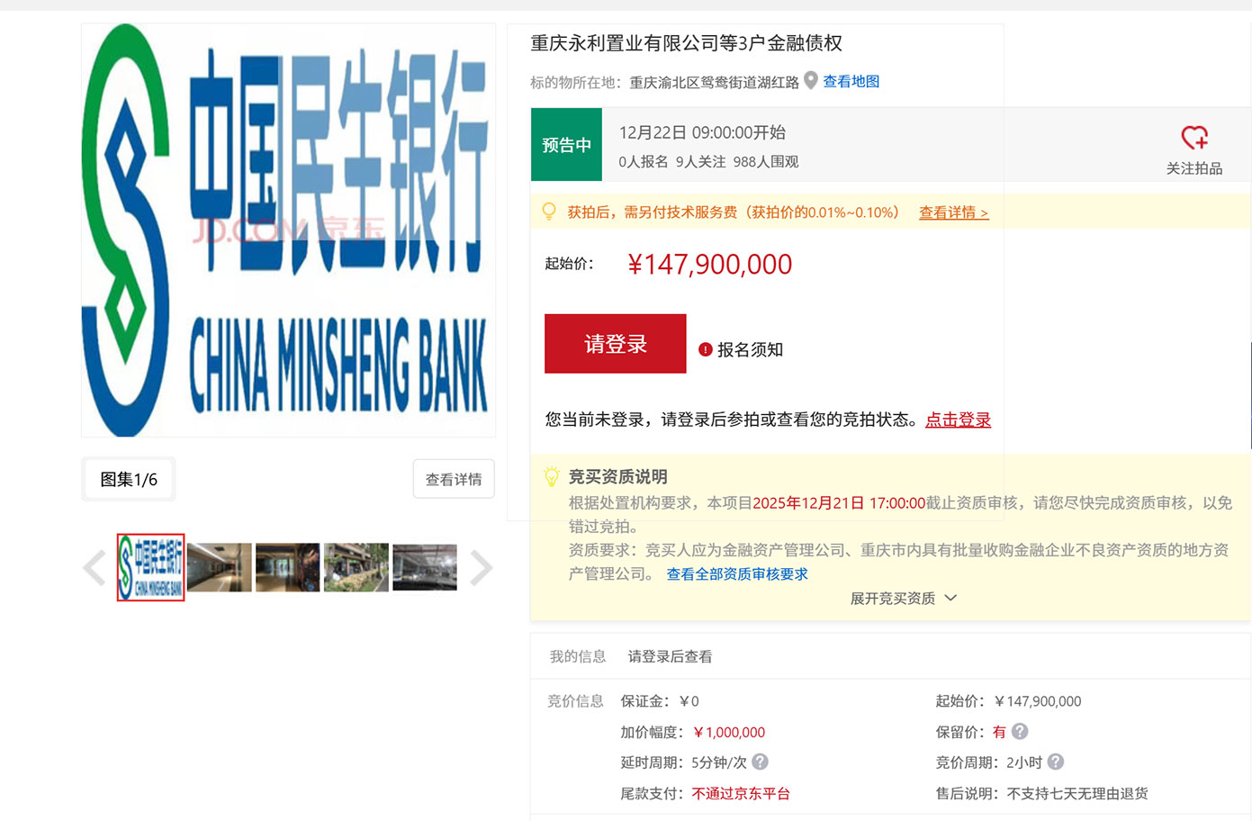近日,中国民生银行重庆分行在京东资产交易平台挂牌转让一笔“恒大系”的债权,涉及重庆永利置业有限公司等3户金融债权。相较9.92亿元的债权合计金额,这笔债权的起拍价约为1.48亿元,接近“1.5折”。