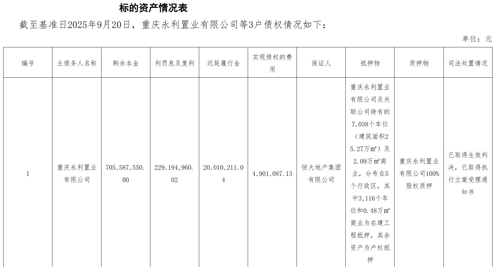 挂牌信息显示,此次转让的核心资产为重庆永利置业有限公司的债权。具体来看,重庆永利置业有限公司债权本金7.06亿元,复利及罚息2.29亿元,迟延履行金2001.02万元,实现债权的费用490.1万元,债权合计9.6亿元。