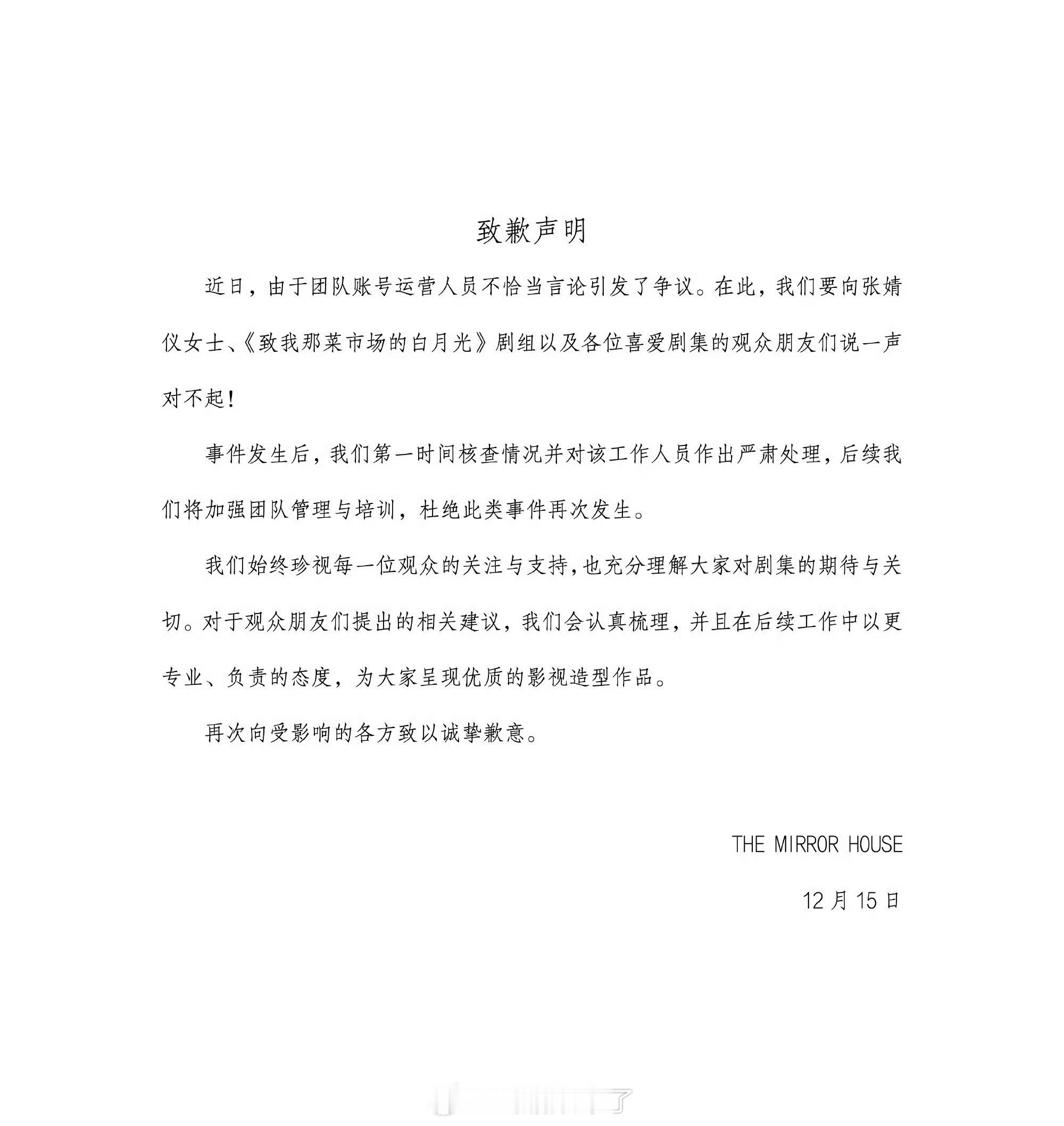 张婧仪新剧《致我那菜市场的白月光》造型团队发布致歉声明,已对工作人员作出严肃处理