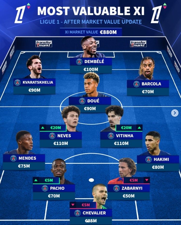 直播吧12月15日讯德转更新了法甲球员身价榜,并列出了当前的法甲最贵阵,巴黎包揽全部11席,其中3人身价过亿。