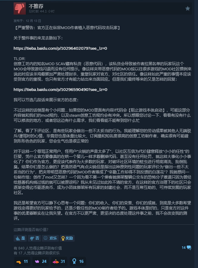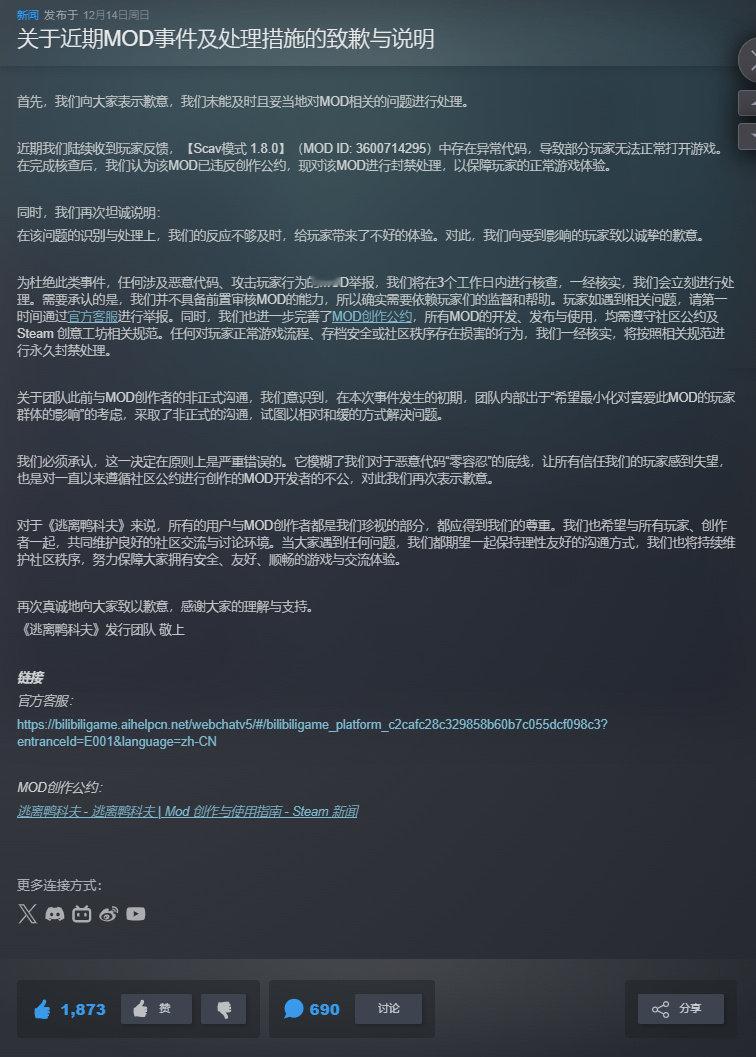 《逃离鸭科夫》于昨日发布了道歉信,起因是创意工坊中一个名为“Scav模式 1.8.0”的MOD被作者植入恶意代码,会导致被其拉黑的玩家无法启动游戏且无任何提示。对此官方并没有直接对MOD做出任何惩罚,反而通过送MOD作者周边,要求其修改代码。此举引发玩家对官方的不满。逃离鸭科夫道歉