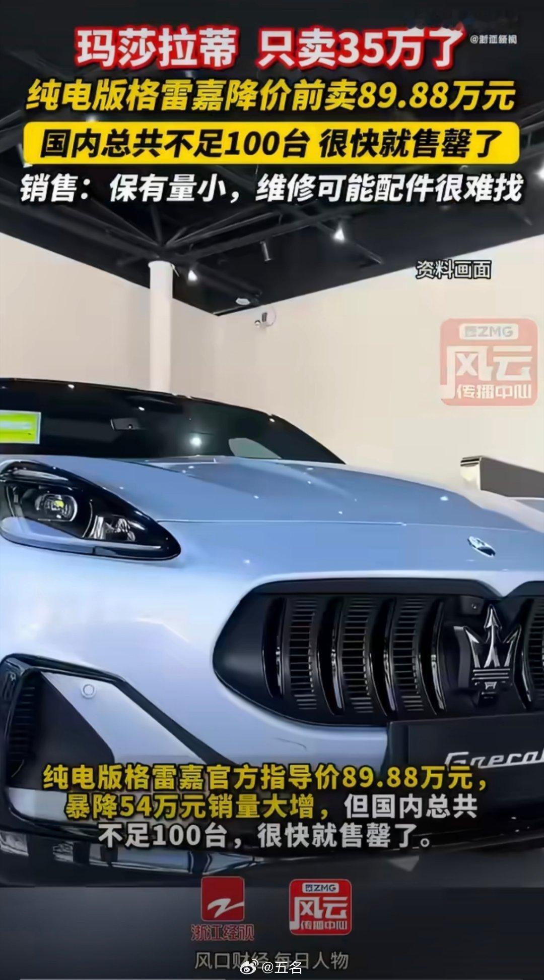 销售直言不建议买35万玛莎拉蒂不建议客户买纯电版,主要是因为保有量小,万一以后出现问题,维修会很麻烦,配件很难找……那是不是可以整一台投资,当配件卖,能赚一台玛莎拉蒂的钱不