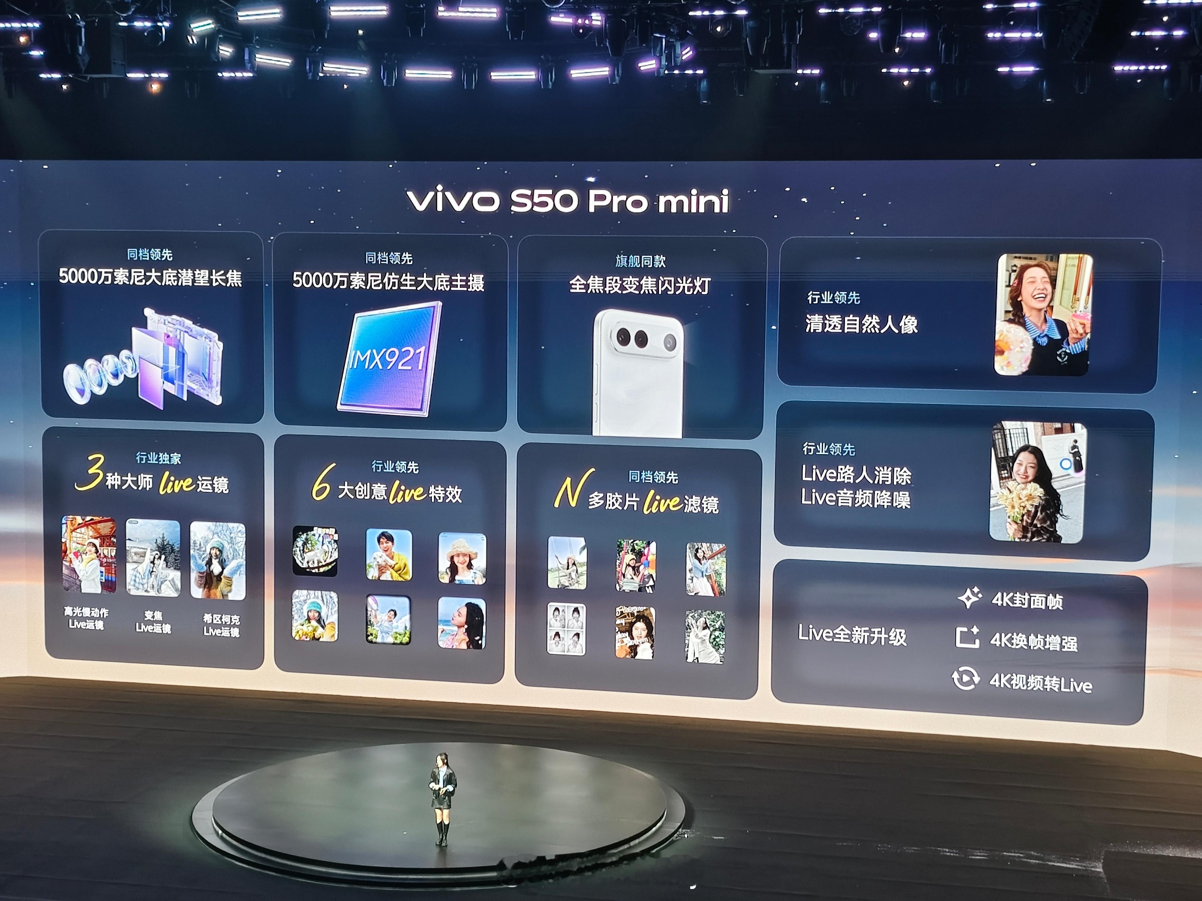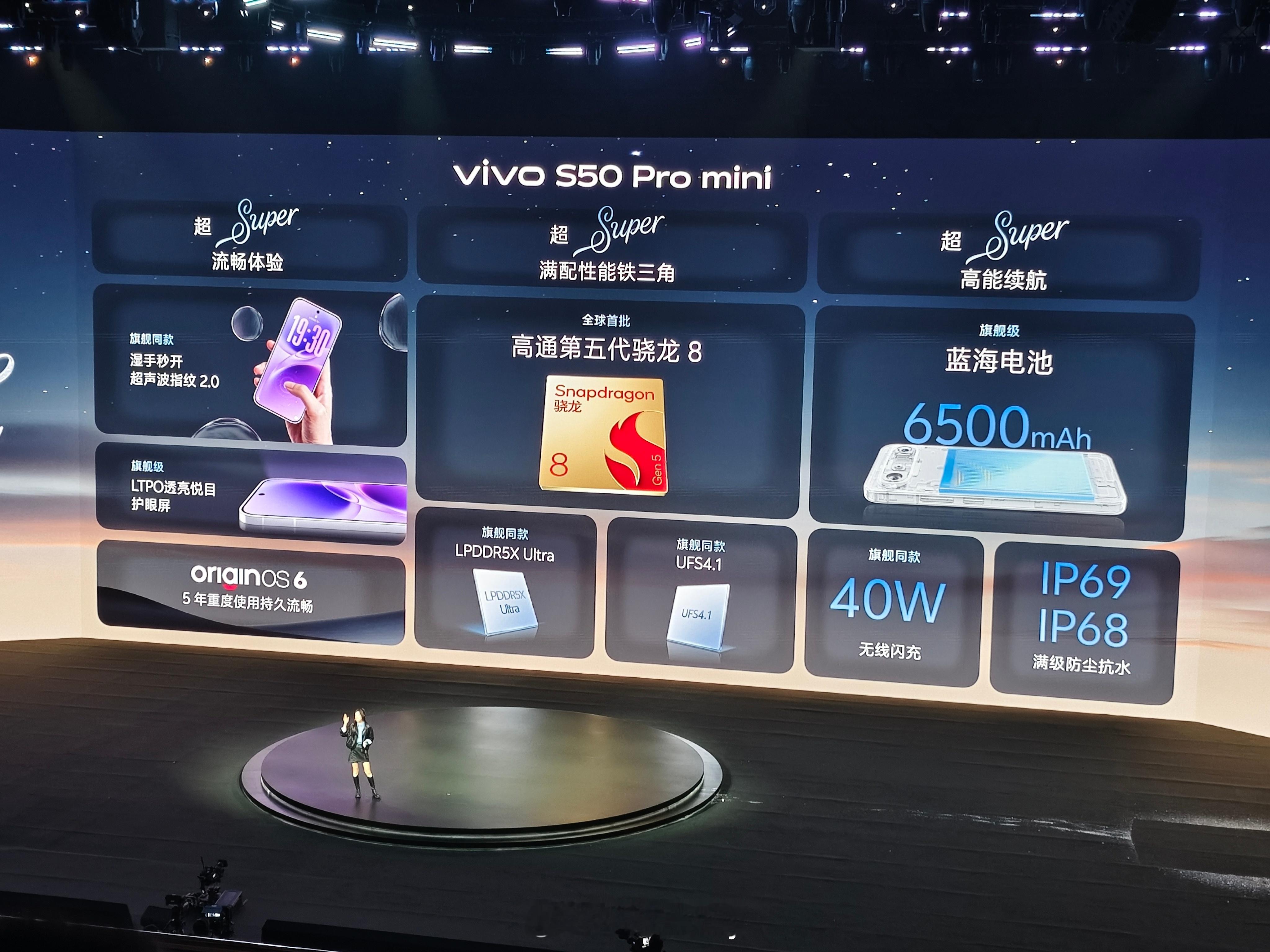 现在叫mini的都这么强了么。第五代骁龙8旗舰芯片,6500mAh大电池,90W超快闪充和40W无线闪充。6.31英寸小直屏,手感好,表现佳, 呈现棒。最重要的是拍照好,索尼IMX921超感光仿生大底主摄,蓝厂自研VCS仿生感光技术,随手拍清晰又通透。更是带来了F1.57,光圈进光量提升43%,夜晚拍也出片。更是支持全焦段变焦闪光灯,能在五大人像焦段下智能调节光效,各种光线轻松拿捏。vivo s50vivo发布会