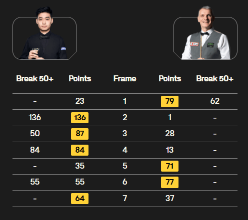 全场比赛,斯佳辉打出一杆破百(136)和三杆50+(88、74、55),马克-戴维斯打出单杆62分。