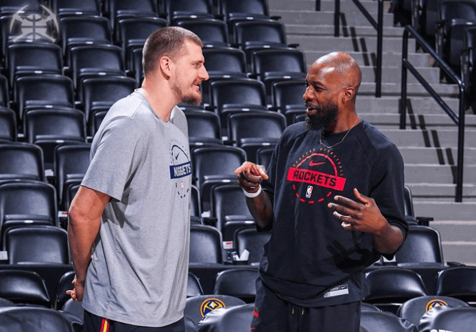 赛前掘金在官方社交媒体上晒出一张约基奇与火箭球员杰夫-格林交谈的照片,并配文道:“很高再次见到你兴,杰夫。”