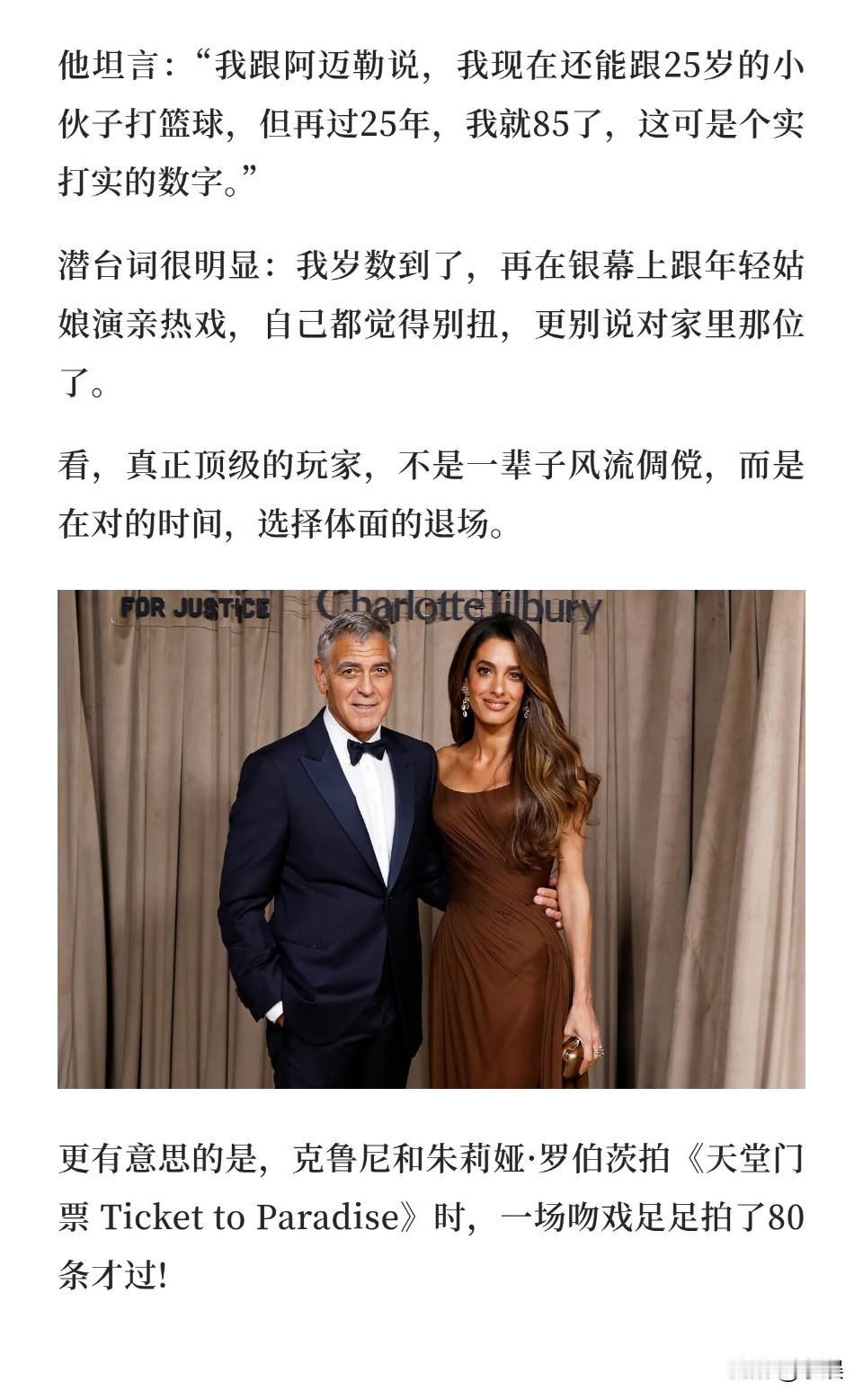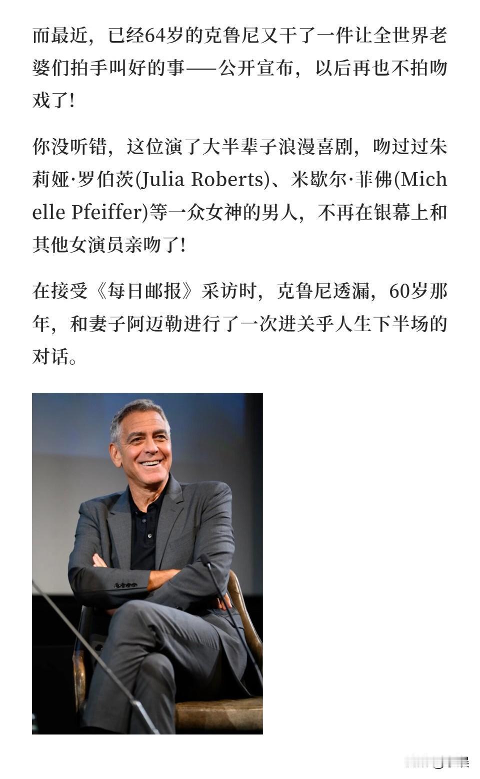 乔治·克鲁尼宣布不再拍吻戏! 他都这么大岁数了……观众真的还想看他吻戏吗?![石化]他是不是把自己和皮特搞混了,皮特吻戏还是有人愿意买账,他都有老人味了0个人想看他吻戏吧?![石化] 应该不是为了他老婆 要真是因为老婆从结婚开始就不拍了现在不拍估计是觉得自己这个年龄拍吻戏画面不会太理想吧…[石化]乔治克鲁尼