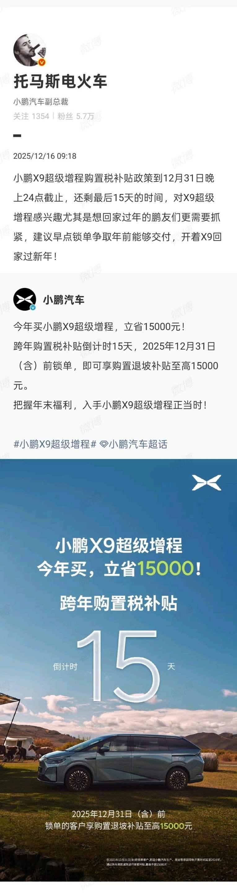 小鹏X9超级增程的购置税补贴真的要倒计时了~只剩最后15天,现在入手直接省15000块,这羊毛,想买X9的朋友必须得薅呀难怪这台车自上市就一直爆火,上市1小时就打破大定纪录,11月交付直接干到3234台,现在交付周期已经延长到7-9周了,想赶在过年开新车回家的朋友,真得抓紧下单了~小鹏高管建议立刻下单争取开X9回家过年小鹏高管提醒X9增程购置税进入倒计时