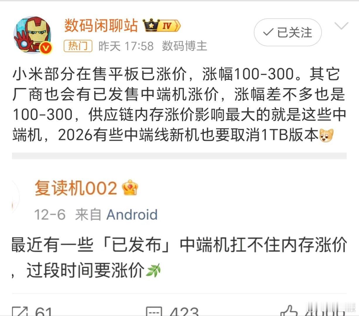 小米多款平板涨价小米平板已经开始涨价了,涨幅在100~200元。现在小米开了头,不知道其它家会不会也跟着涨。所以,面对已发布的手机、平板等电子产品价格上涨,你还愿意买吗?