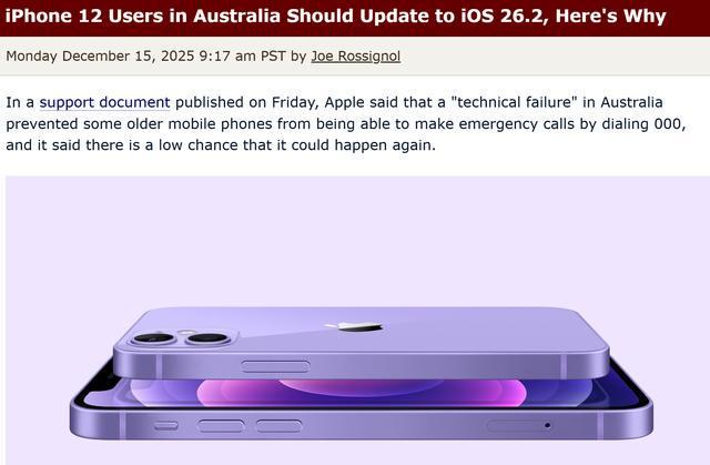 值得注意的是,此次故障并非苹果设备专属,近期已有新闻报道显示三星部分手机也受到类似影响。苹果明确了不受影响的机型范围:iPhoneXS、iPhoneXR、iPhone11以及所有iPhone13及更新机型均未受波及。针对iPhone12用户,苹果指出上周发布的iOS26.2系统更新已针对该场景提供支持,可有效避免类似问题。