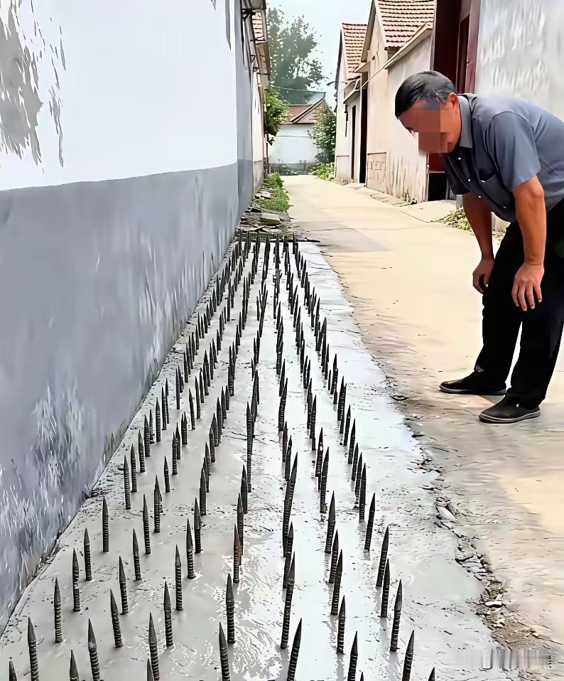 这人是又聪明又坏!为了保护自己的房子,担心被过往的车刮到,竟用了这个方法,在墙根处,插了好几排尖尖的铁棍,看着就好恐怖。 想想如果小朋友在玩耍时不小心跌倒在上面,如果晚上行人不小心走到上面,后果将不堪设想! 他这么做太自私了,他只想着自己的房子别被刮到,他完全不考虑别人的安全,他怎么想到这么个狠招啊,太吓人了,这是危害公共安全啊!