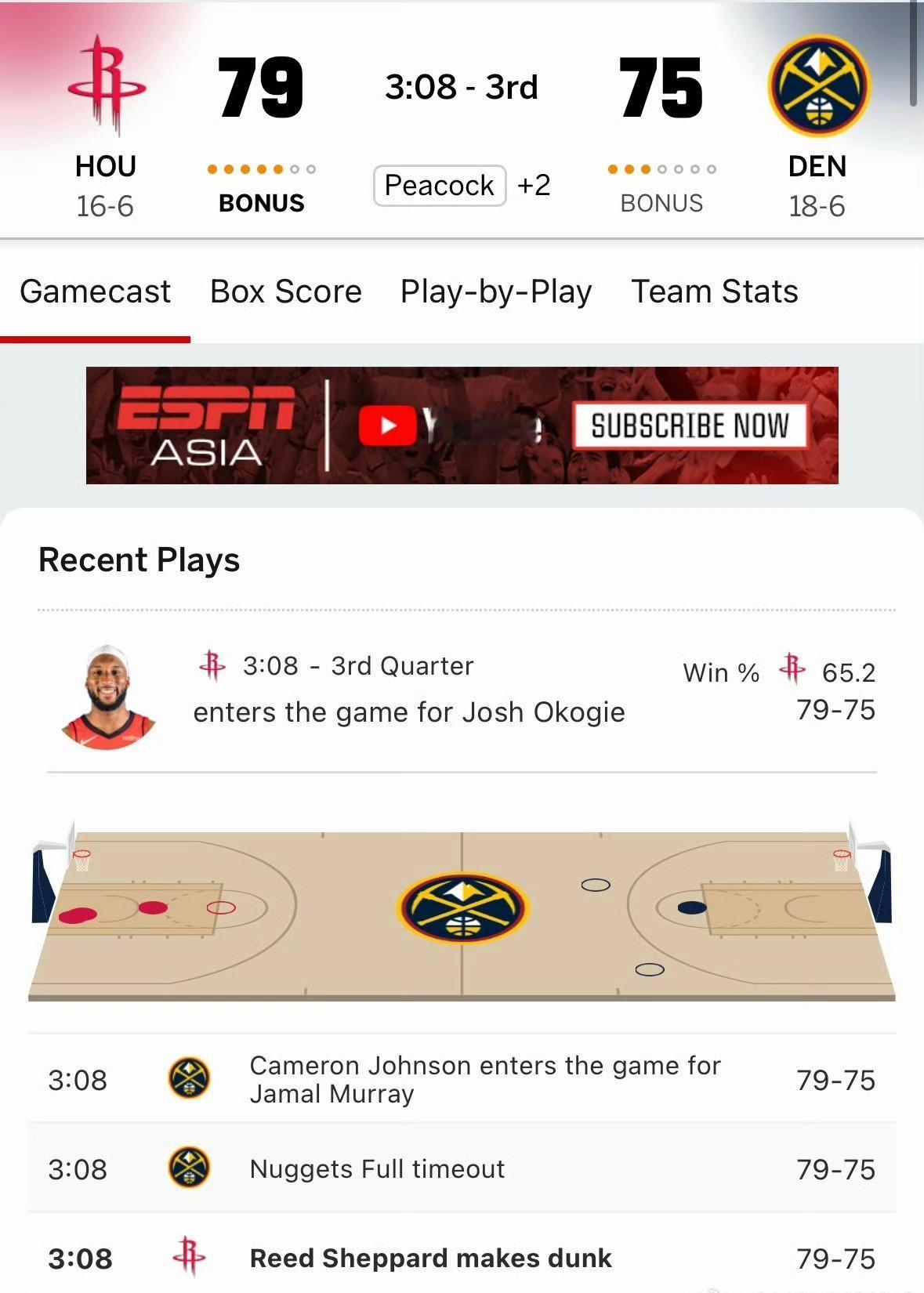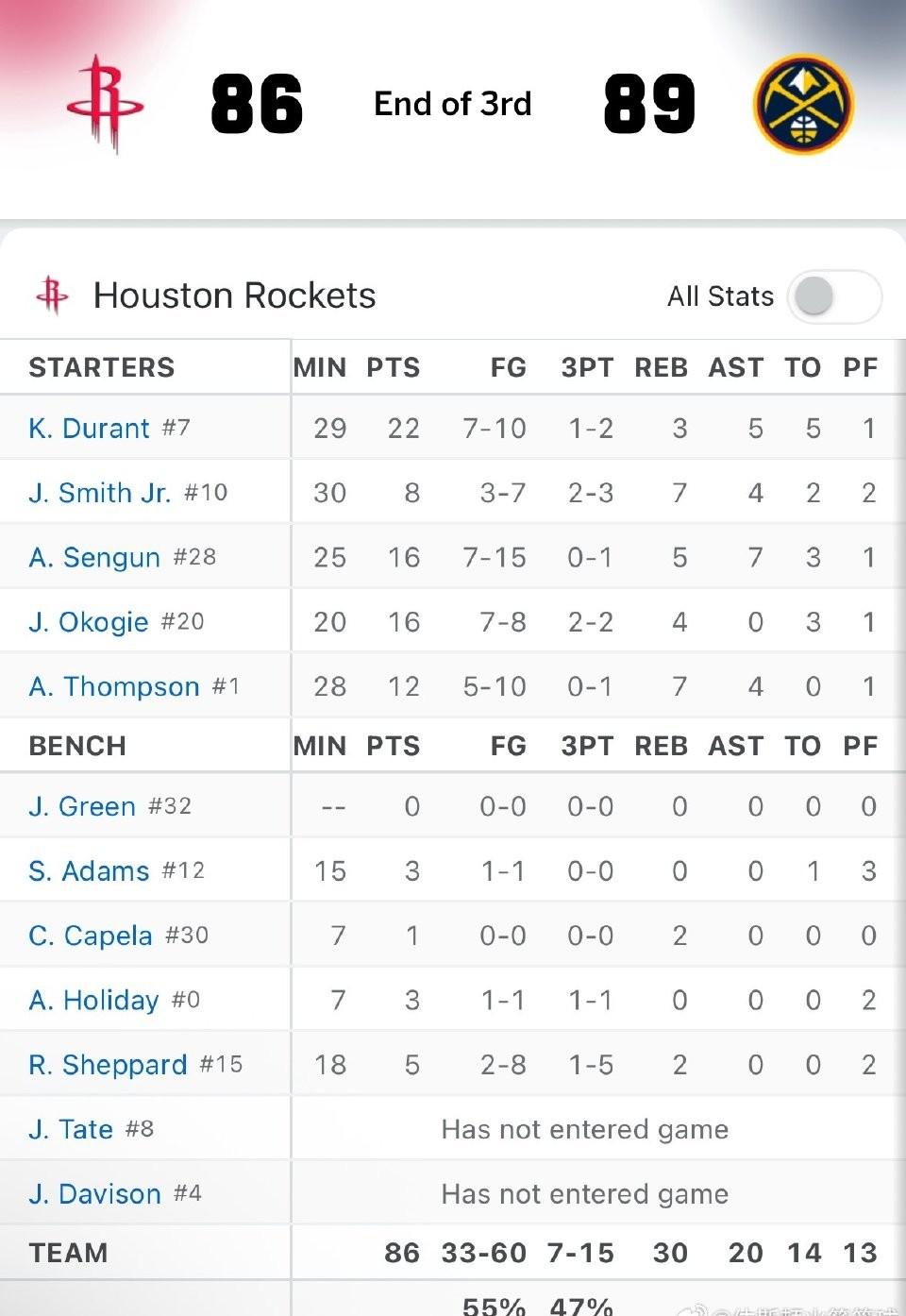 第三节还有3分钟时,火箭打了一波8比0反超掘金4分,火箭79-75掘金。 随后掘金也打出一波14-7小高潮,三节结束后,掘金反超3分。掘金89-86火箭。 今天亚当斯一个篮板都没有,我是真没想到……今天谁想赢都得脱层皮吧。