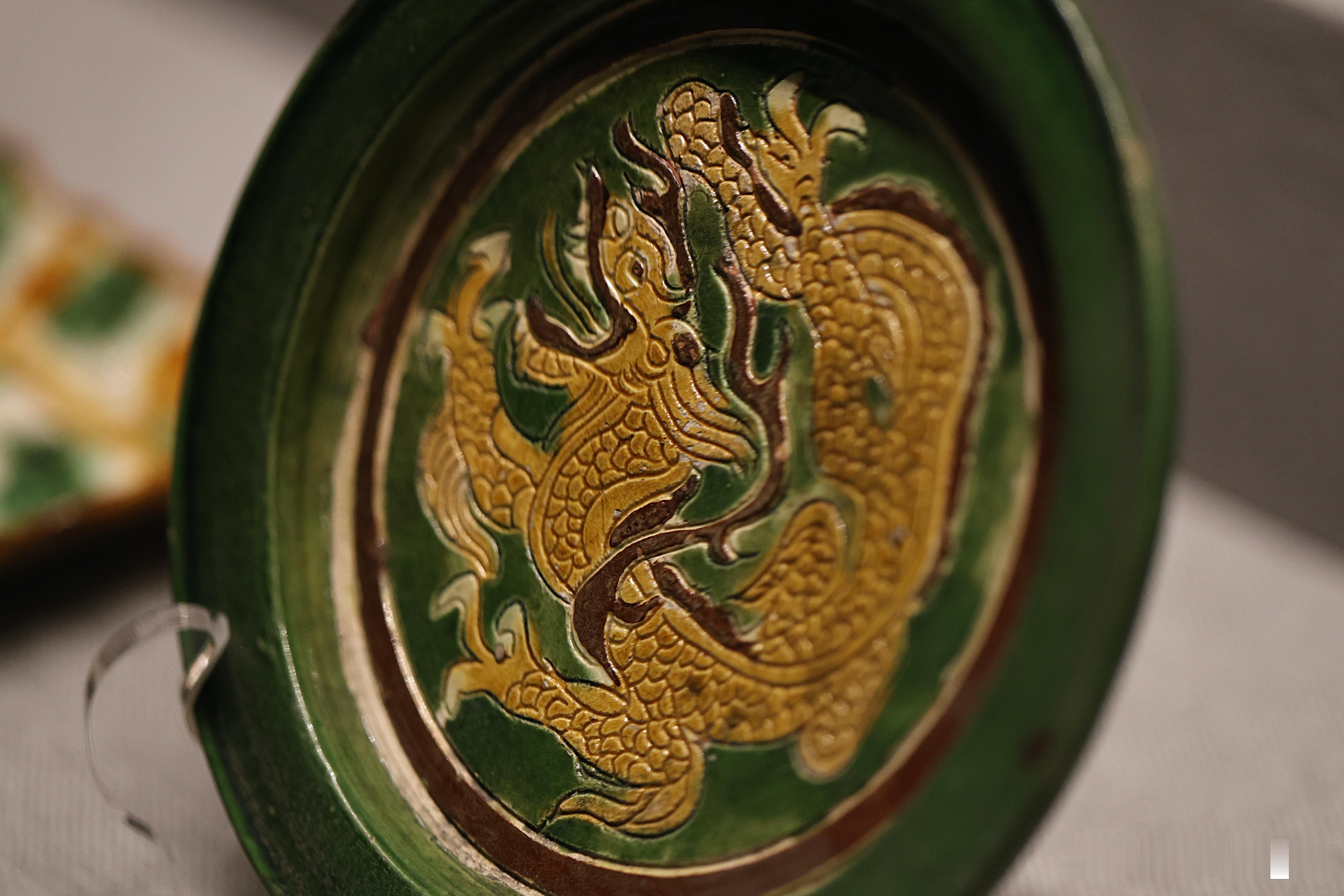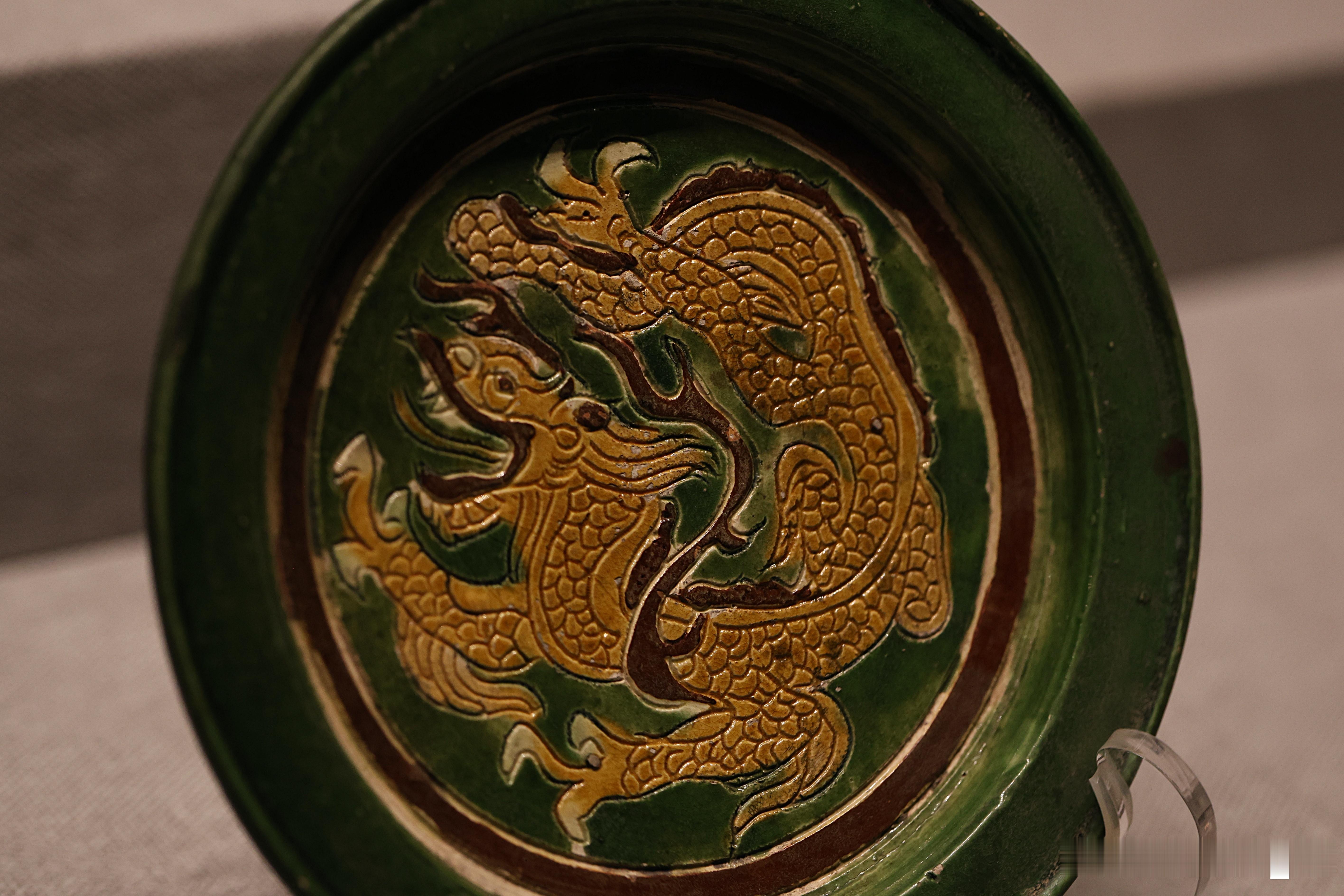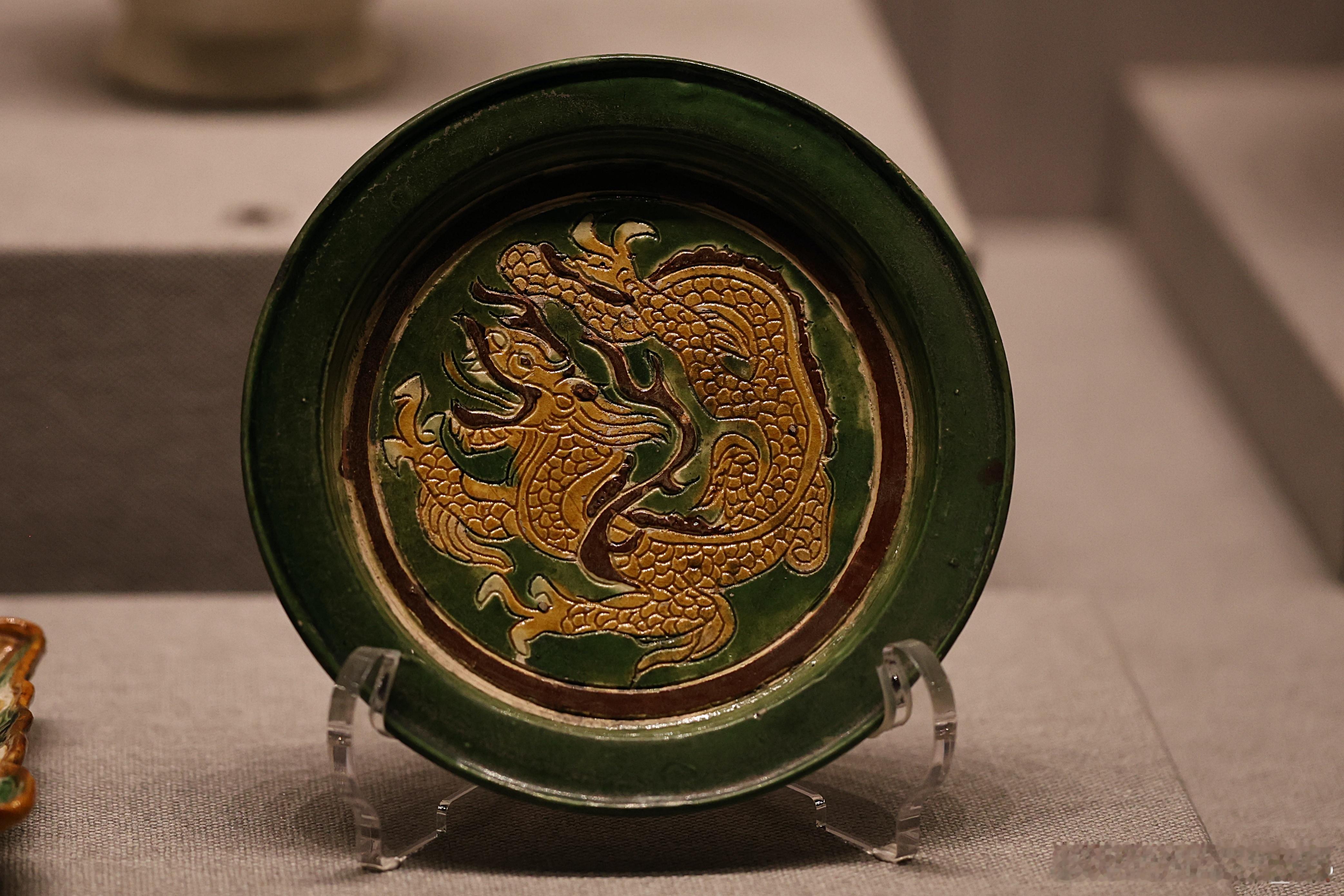 三彩刻划团龙纹折沿盘 辽 (907-1125)故宫博物院藏盘折沿,沿边起棱,浅腹,广底,圈足。内、外施绿釉,内底除绿釉外,还施褐色和黄色釉。内底刻划双圆圈内刻划一条团龙,龙张口伸舌,身盘曲,龙爪伸张有力,形象威猛。黄色腾龙在绿釉衬托下,格外醒目。 此盘造型规整,设色较重,是辽代三彩器的代表作品。