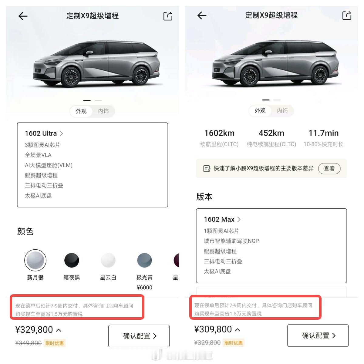 小鹏高管提醒X9增程购置税进入倒计时,还等什么,把握好这最后15天锁单能省下1.5万元呢,想想1.5万元够充多少电而且现在X9交付周期已经去到7-9周了,就算你说不在意这1.5万,小鹏高管建议立刻下单争取开X9回家过年,早提车早享受也是很爽的吧?