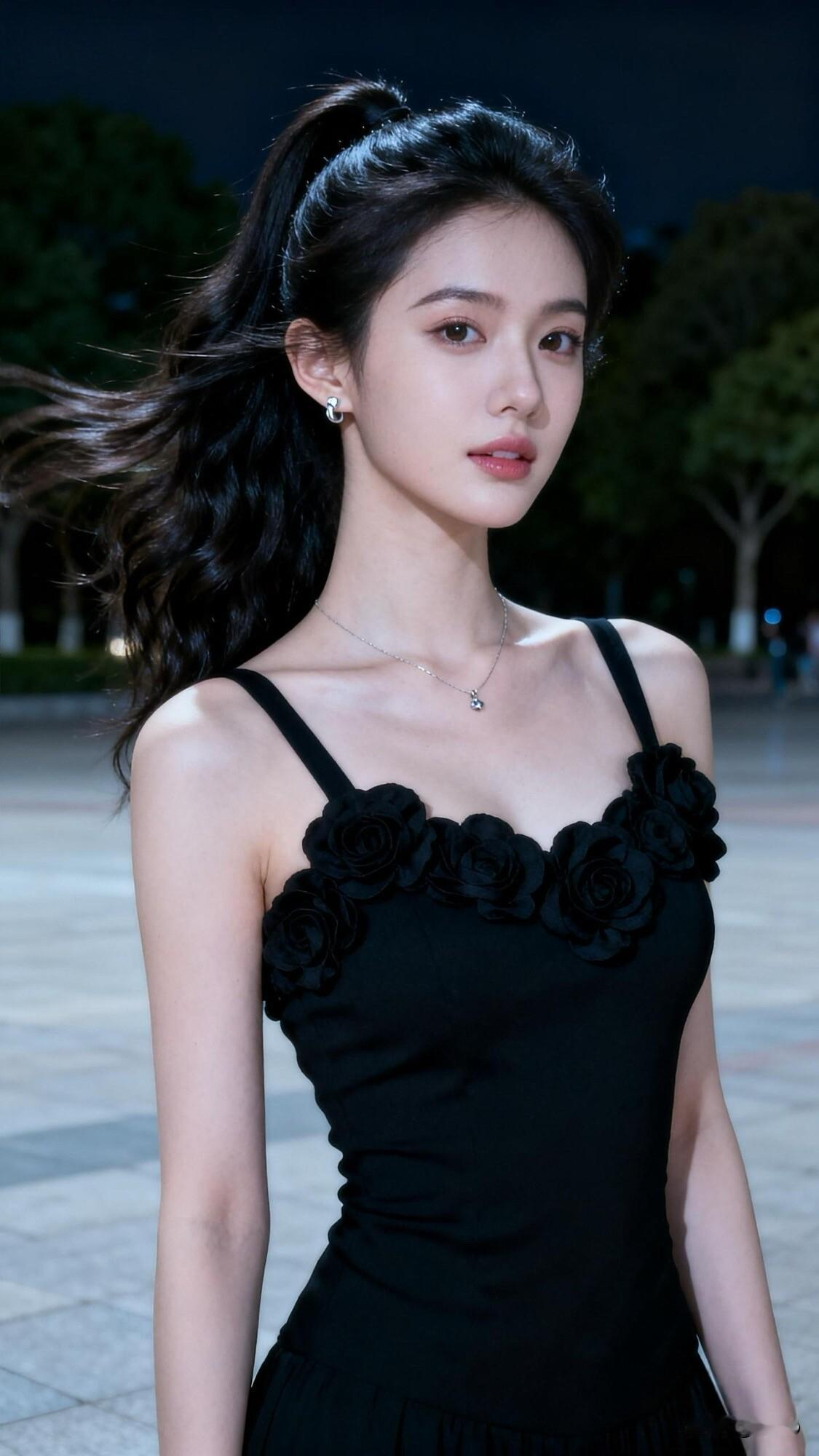 夜晚的优雅,黑色玫瑰连衣裙,尽显迷人魅力。