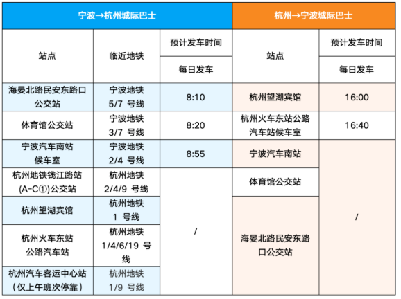 12月18日起,杭州往返宁波“浙客行·城际巴士”将试运营。试运营期间,杭州往返宁波城际巴士每天1班,单程优惠票价是29.9元/人(成人、儿童同价)。
