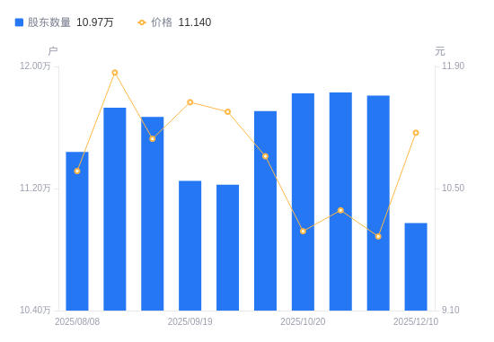 日期A股户数(户)流通A股户均持股数(股)户均持股市值(万元)2025-12-101097369599.3010.692025-11-201180928920.018.882025-10-311183008904.329.132025-10-201182358909.228.922025-10-101170778997.349.782025-09-301122449384.7510.682025-09-191125049363.0510.762025-09-101166879027.419.992025-08-201173008980.2310.622025-08-081143939208.449.85