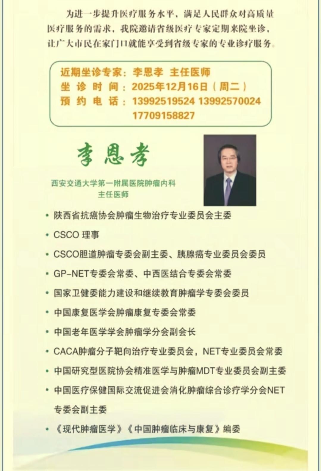 专家义诊信息。西安交大一附院肿瘤科专家李恩孝12月16日来我院坐诊