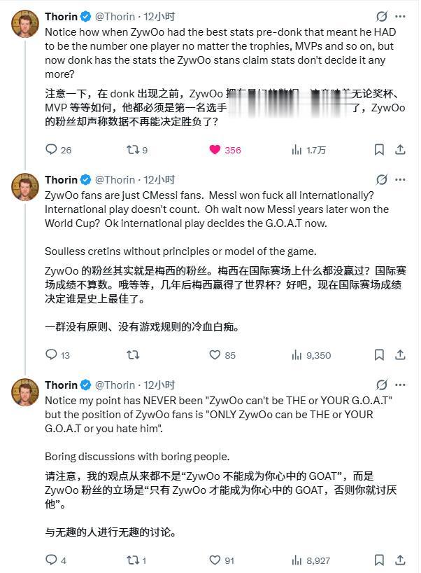 Thorin:ZywOo的(部分)粉丝就跟梅西的粉丝一个样。梅西之前国际赛事啥都没拿?那粉丝会说“国际比赛不算数”。结果过了几年梅西拿世界杯了?行,现在“国际比赛是判定GOAT的标准”了。一群没灵魂的蠢货,既没原则,也不懂比赛的门道。