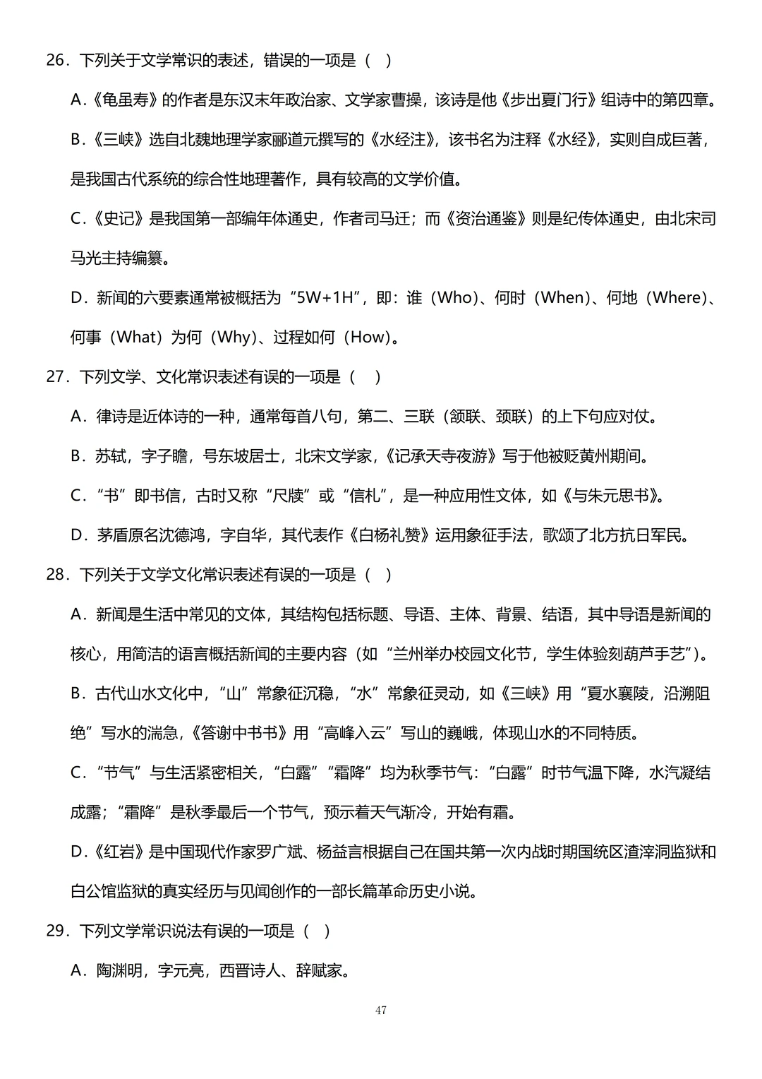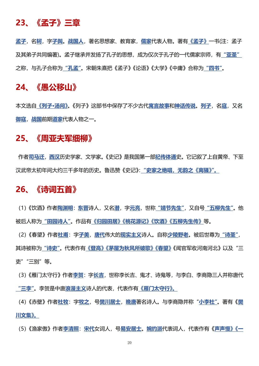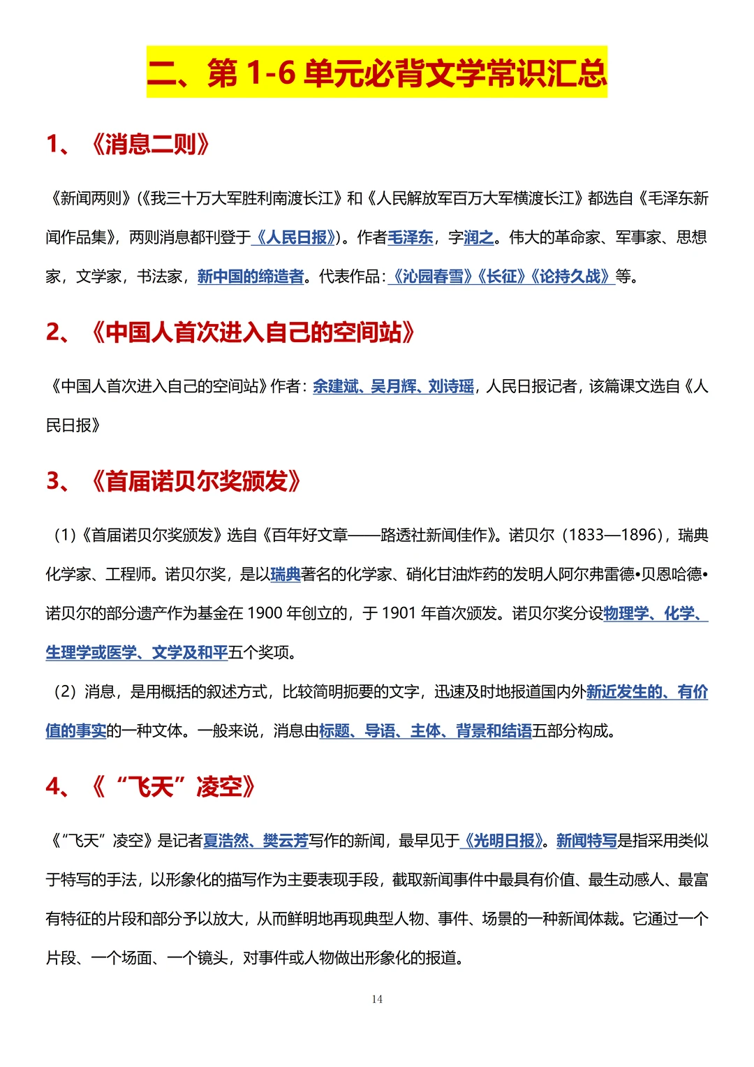 [星R]二、第1-6单元必背文学常识 包含1-6单元每课的文学常识,其中古诗文的文学常识是高频考点!例如《周亚夫军细柳》选自《史记》,作者是西汉的司马迁。《史记》是我国第一部纪传体通史,鲁迅评价其为 “史家之绝唱,无韵之《离骚》”。