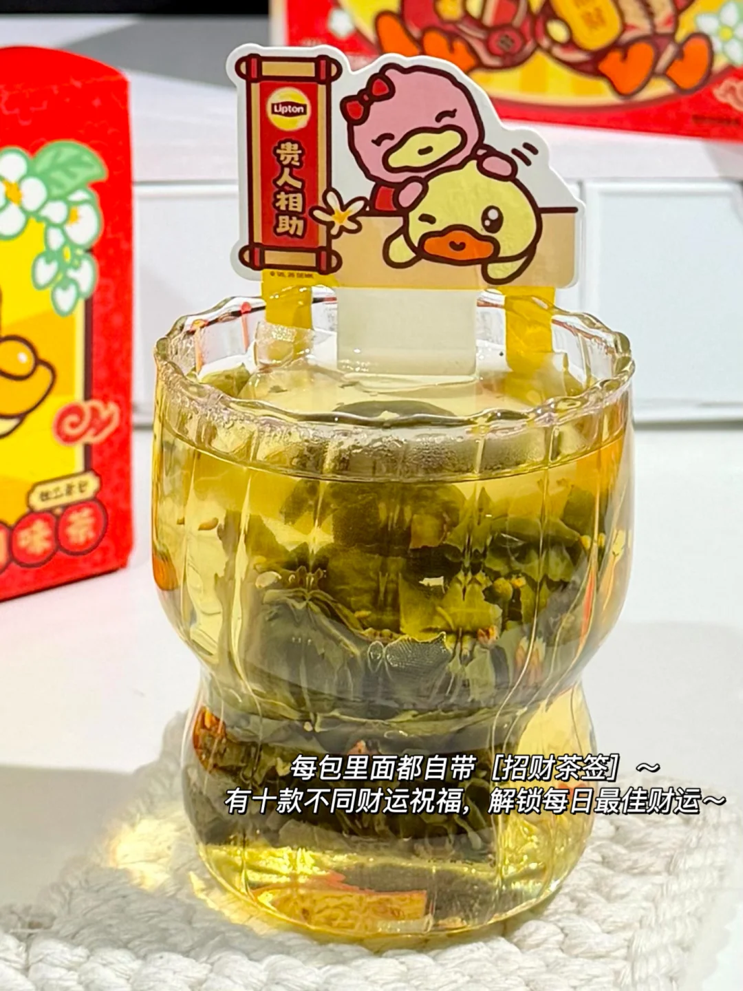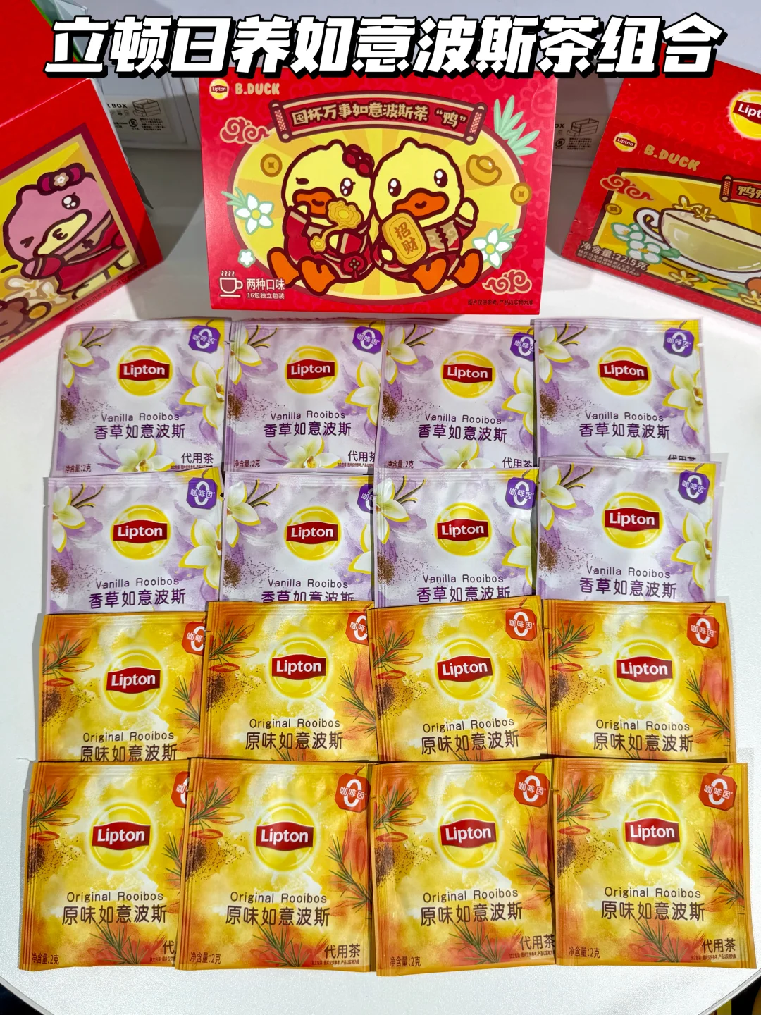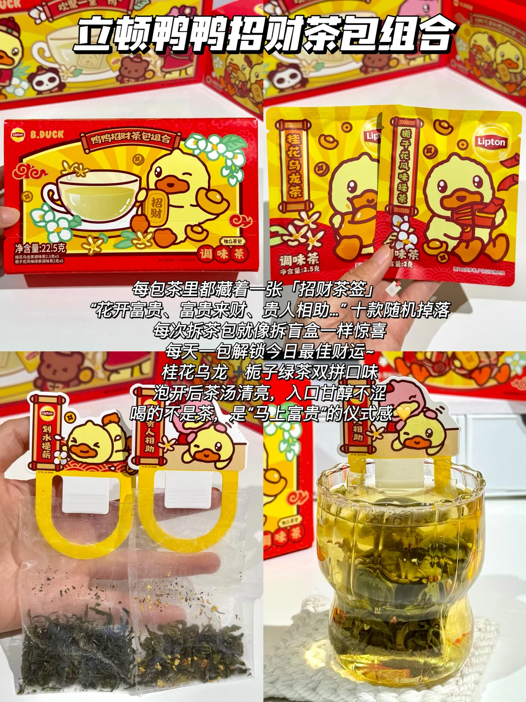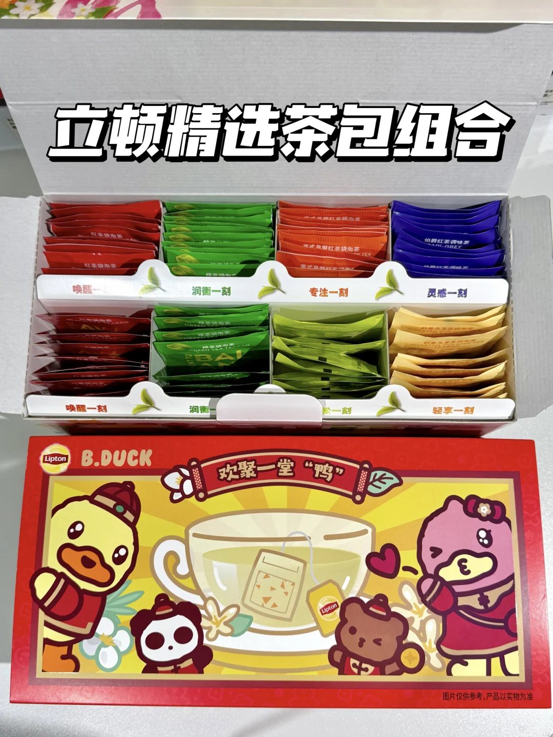 谁懂啊!居然有「招财味」的花茶!! 立顿x B.Duck小黄鸭联名太会玩了!! 喝一口直接把「富贵」喝进嘴里!!打工人闭眼冲!! 🍵【立顿鸭鸭招财茶包】组合 每包茶里都藏着一张「招财茶签」🔖 “花开富贵、富贵来财、贵人相助…” 十款随机掉落 每次拆茶包就像拆盲盒一样惊喜 每天一包解锁今日最佳财运~ 桂花乌龙➕栀子绿茶双拼口味 泡开后茶汤清亮,入口甘醇不涩 喝的不是茶,是“马上富贵”的仪式感💛 🍃【立顿日养如意波斯茶】组合 0糖0脂0咖啡因的如意波斯茶,来自南非的宝藏草本茶 原味+香草两种口味,丝滑甘醇,暖胃又暖心 晚上喝也不怕睡不着~ 寓意新年万事如意,喝下去就是“如意”加持! 🍂【立顿精选茶包】组合 6款经典口味一次集齐:红茶、绿茶、茉莉花茶、韵香乌龙、英式早餐红茶、伯爵红茶 整整80包!量大实在,适合与同事、家人分享 团团圆圆一起喝,寓意“茶聚人团圆”~ 🎁联名周边也超可爱! 满额就送小黄鸭B.Duck限定周边!! 招财红包🧧、招财发卡玩偶鸭手机背夹、满满财运元素的发财流水杯 摆在桌上都是浓浓的好运氛围~