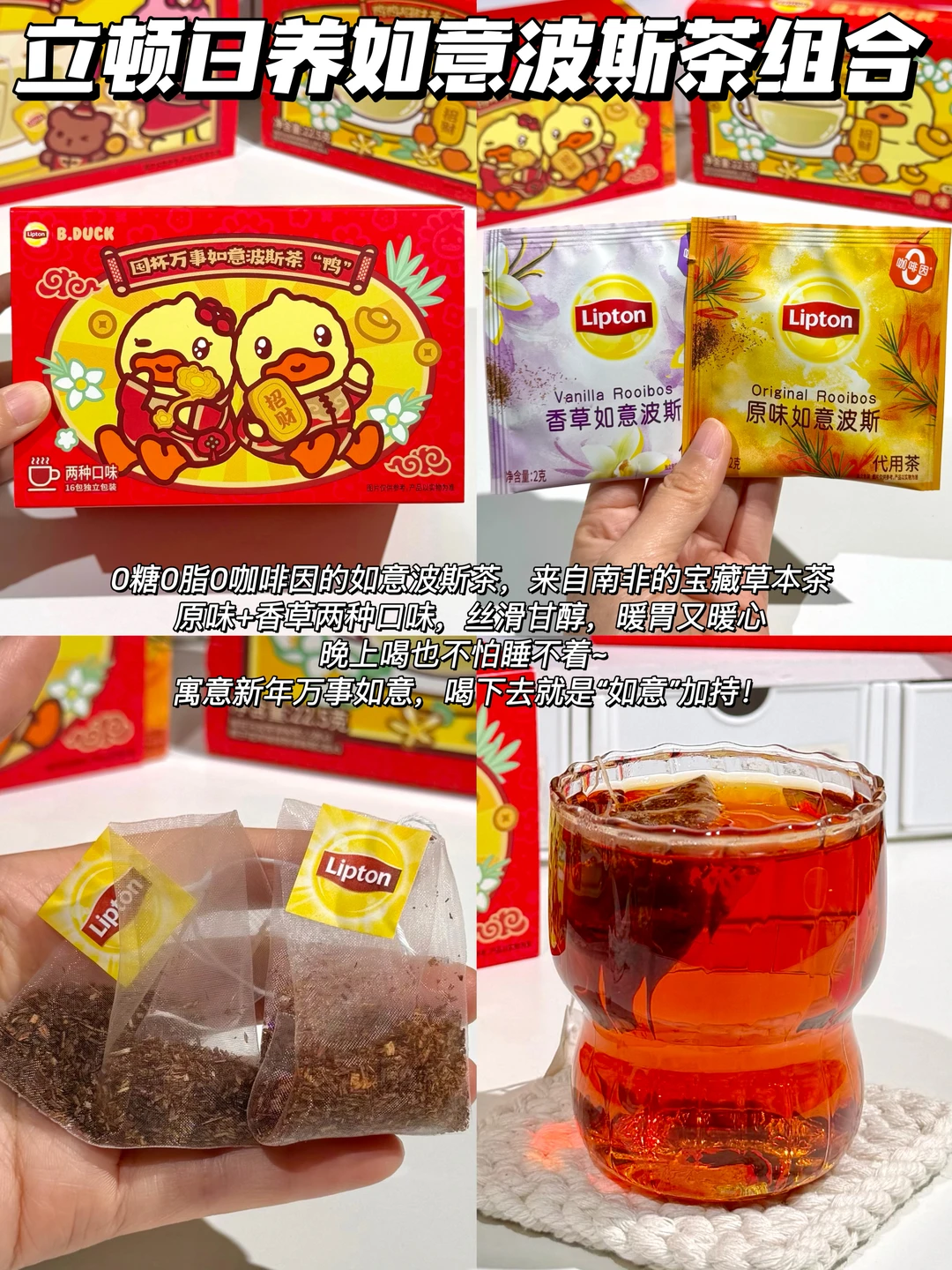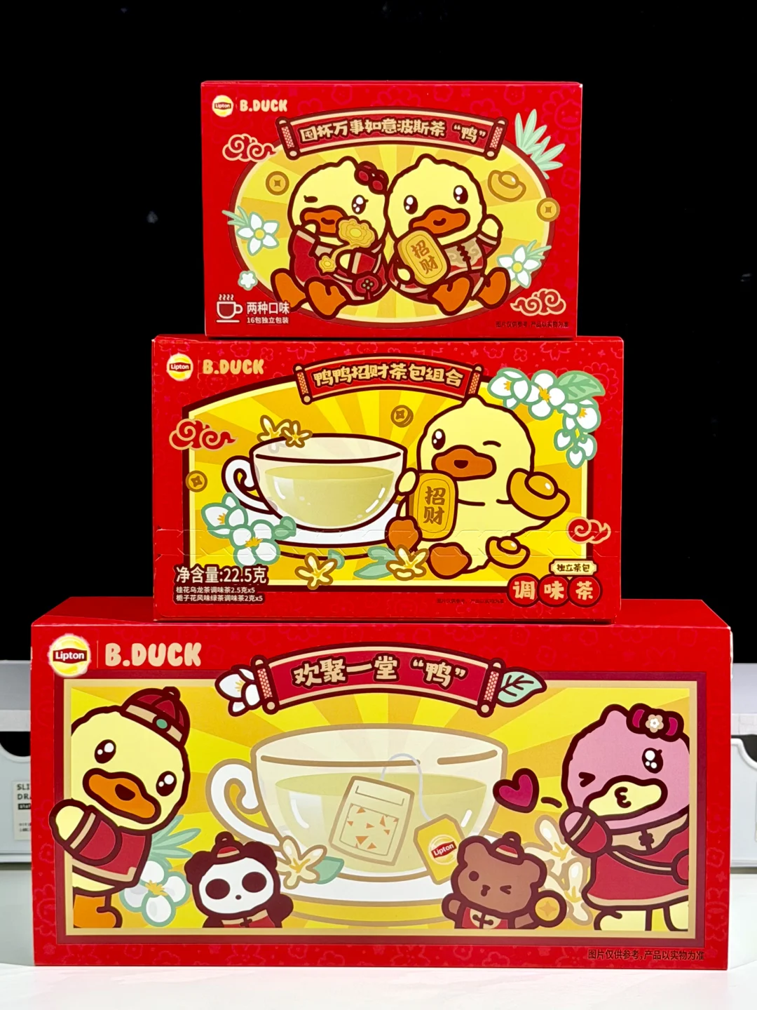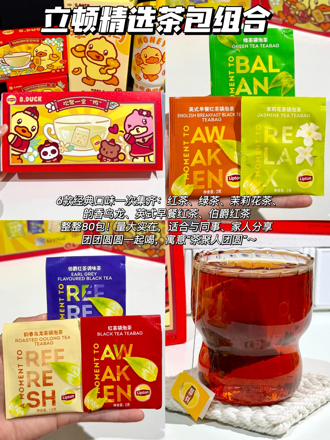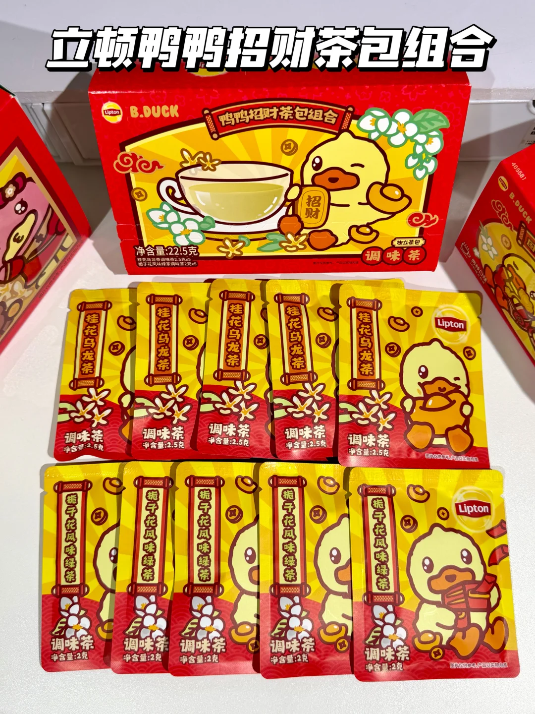 谁懂啊!居然有「招财味」的花茶!! 立顿x B.Duck小黄鸭联名太会玩了!! 喝一口直接把「富贵」喝进嘴里!!打工人闭眼冲!! 🍵【立顿鸭鸭招财茶包】组合 每包茶里都藏着一张「招财茶签」🔖 “花开富贵、富贵来财、贵人相助…” 十款随机掉落 每次拆茶包就像拆盲盒一样惊喜 每天一包解锁今日最佳财运~ 桂花乌龙➕栀子绿茶双拼口味 泡开后茶汤清亮,入口甘醇不涩 喝的不是茶,是“马上富贵”的仪式感💛 🍃【立顿日养如意波斯茶】组合 0糖0脂0咖啡因的如意波斯茶,来自南非的宝藏草本茶 原味+香草两种口味,丝滑甘醇,暖胃又暖心 晚上喝也不怕睡不着~ 寓意新年万事如意,喝下去就是“如意”加持! 🍂【立顿精选茶包】组合 6款经典口味一次集齐:红茶、绿茶、茉莉花茶、韵香乌龙、英式早餐红茶、伯爵红茶 整整80包!量大实在,适合与同事、家人分享 团团圆圆一起喝,寓意“茶聚人团圆”~ 🎁联名周边也超可爱! 满额就送小黄鸭B.Duck限定周边!! 招财红包🧧、招财发卡玩偶鸭手机背夹、满满财运元素的发财流水杯 摆在桌上都是浓浓的好运氛围~