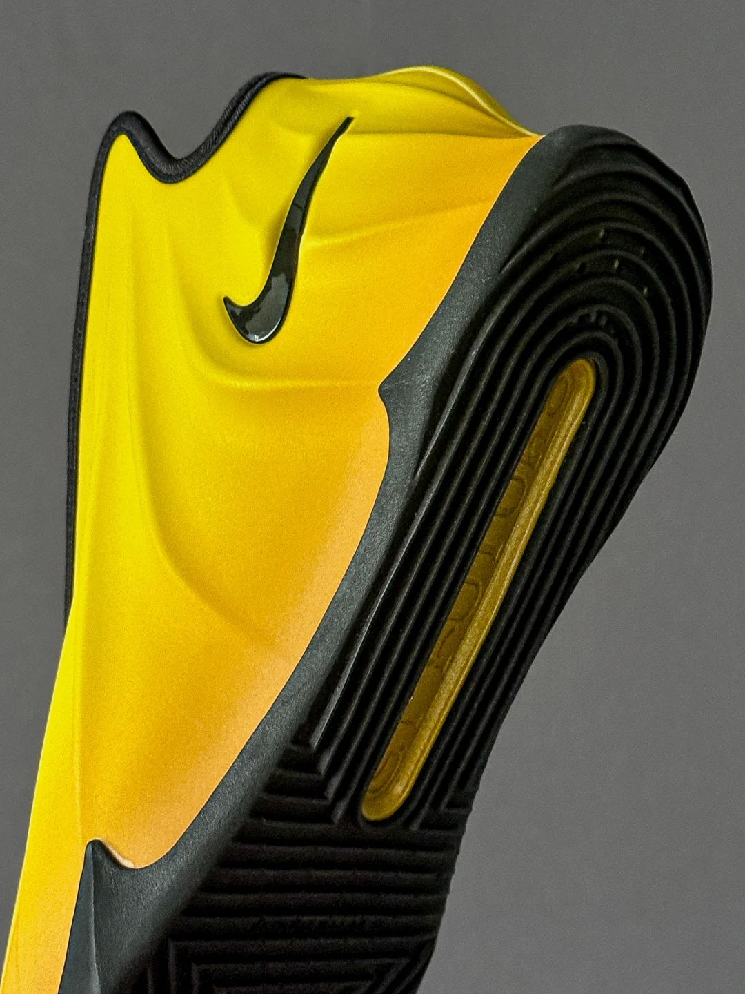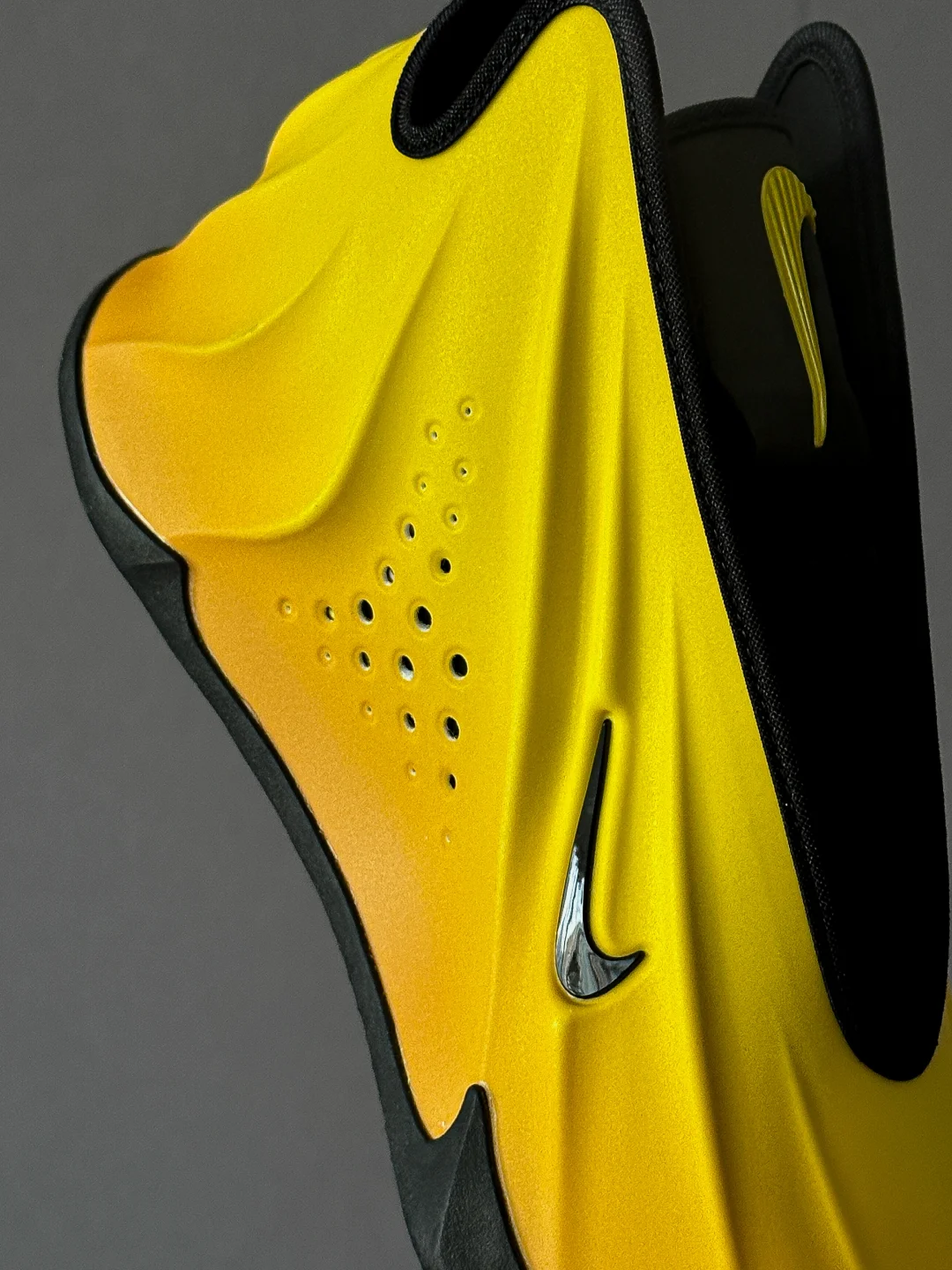 -叠加渐变的颜色,整双鞋从侧面看像是被掀起的窗帘,甚至有种流动建筑的立面效果。而黄色应用在这个鞋身轮廓上,更有种落叶战机的视觉效果。