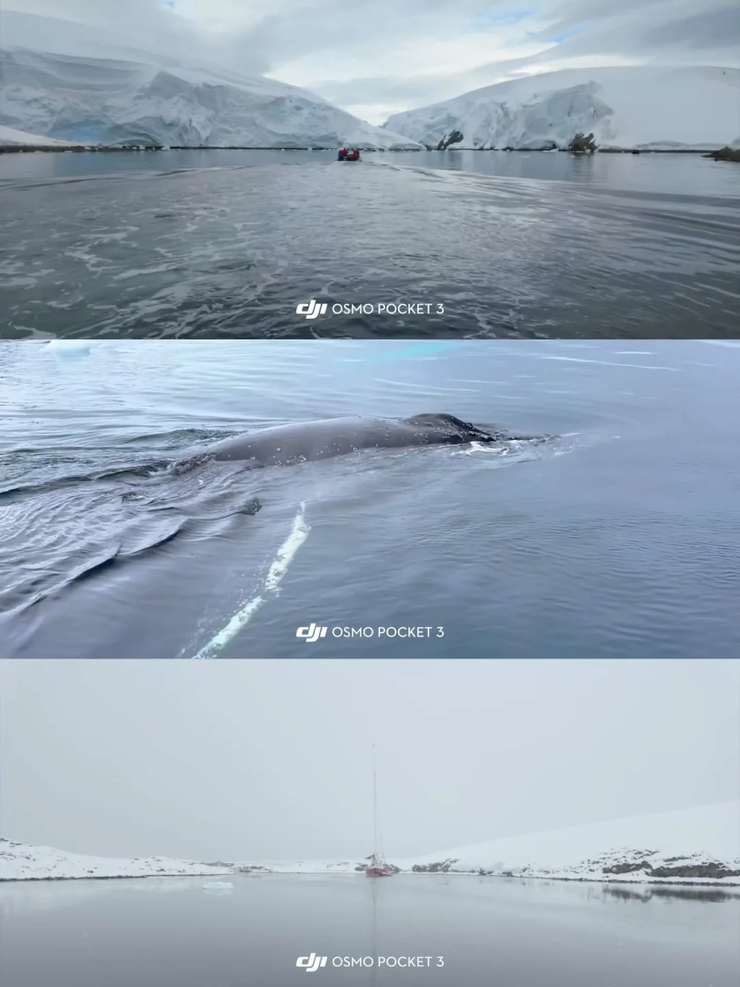 南极,或许是许多人人生的终极目的地 在这里你可以近距离看到鲸鱼浮出水面 听见它沉重而缓慢的呼吸声 企鹅会成群从冰海里跃出来 再像子弹一样钻进水里🐧 因为南极禁止飞无人机 很多人会以为很难拍出有空间感的画面 但其实一根 3 米长的自拍杆 ➕Pocket 3 就能实现类似摇臂的效果 低角度推、慢慢抬、横向扫 画面反而更稳定,也更贴近现场 📷常用的拍摄参数参考: 分辨率:4K / 60fps 色彩:D-Log M 快门:1/120 ISO:尽量锁在 50–200 南极最迷人的地方,不是“震撼” 而是你意识到—— 你只是一个安静的旁观者