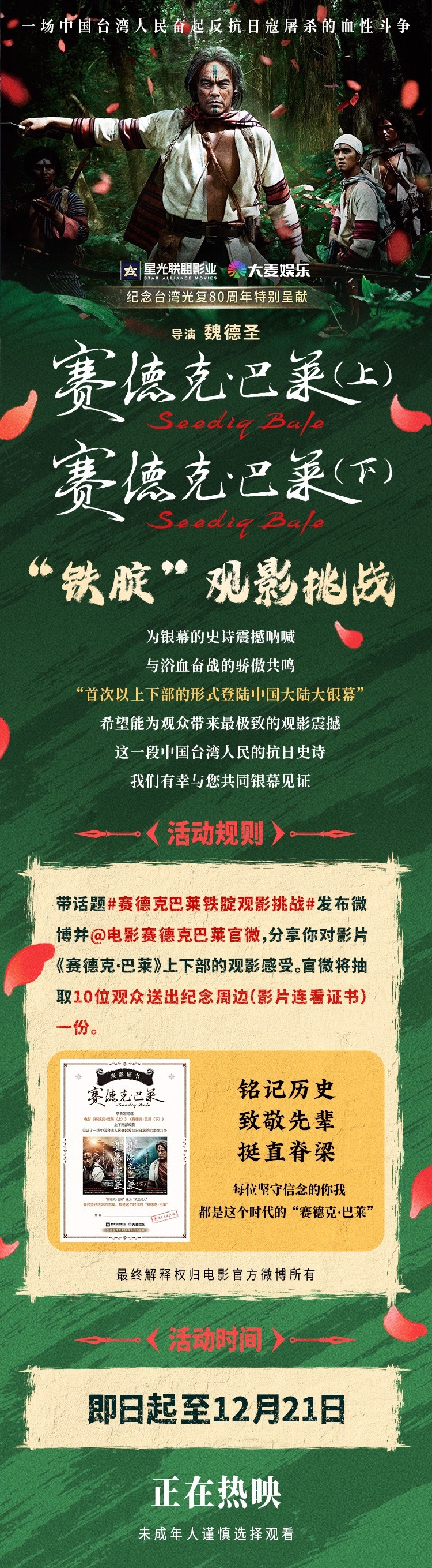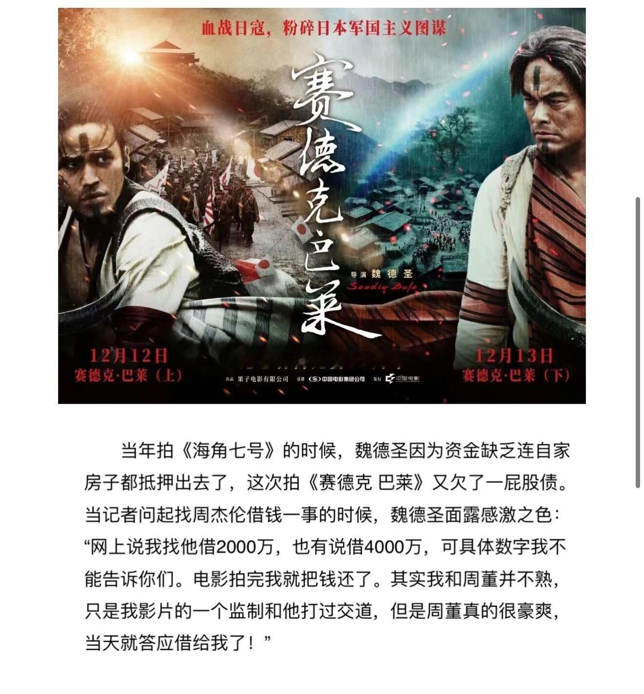 失联276分钟去当天使巴莱了前两天突然短暂失联了四五个小时没出现在这个互联网上,统一回复下,是去看《赛德克·巴莱》了,上下两部连看,看得我有种手机依赖症都快被调理好了的感觉。说真的,我属于“网瘾”很重的人,就算没人给我发消息都要隔几分钟看一次手机,且没什么耐心,平时刷短视频都经常忍不住开倍速…但谁能想到,我那天就硬是一口气看了这个两部加起来有276分钟的电影,全程都没碰过手机,因为看得很沉浸。散场的时候都有种从历史里走了一遍又回到现实的恍惚感,感觉像是完成了一场净化仪式,什么内耗啊焦虑啊都过滤掉了,脑子里只剩下电影里那些悲壮的场景和彩虹桥的图腾。从此自愿加入“天使巴莱”队伍——指逢人就安利“快看!看完你也是真正的人!”,且已经成为“精神股东”,买电影票都觉得不太够,甚至恨不得像周杰伦他们一样给这片子打点钱。这部电影就很适合像我这种偶尔想对抗一下碎片信息轰炸的人,要是也想短暂屏蔽一下工作消息或者现实压力,推荐也来挑战这部,不仅能让你放下手机,也能收获一段很棒的观影体验(因为电影本身的质量也很高啊),还能顺便参与一下官方发起的“铁腚”挑战,认证证书我先笑纳了~