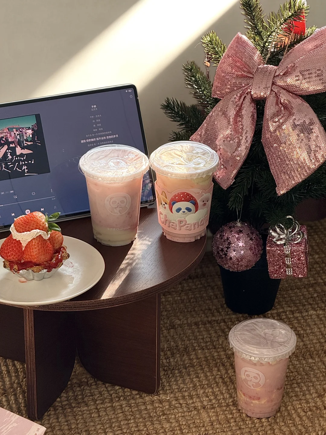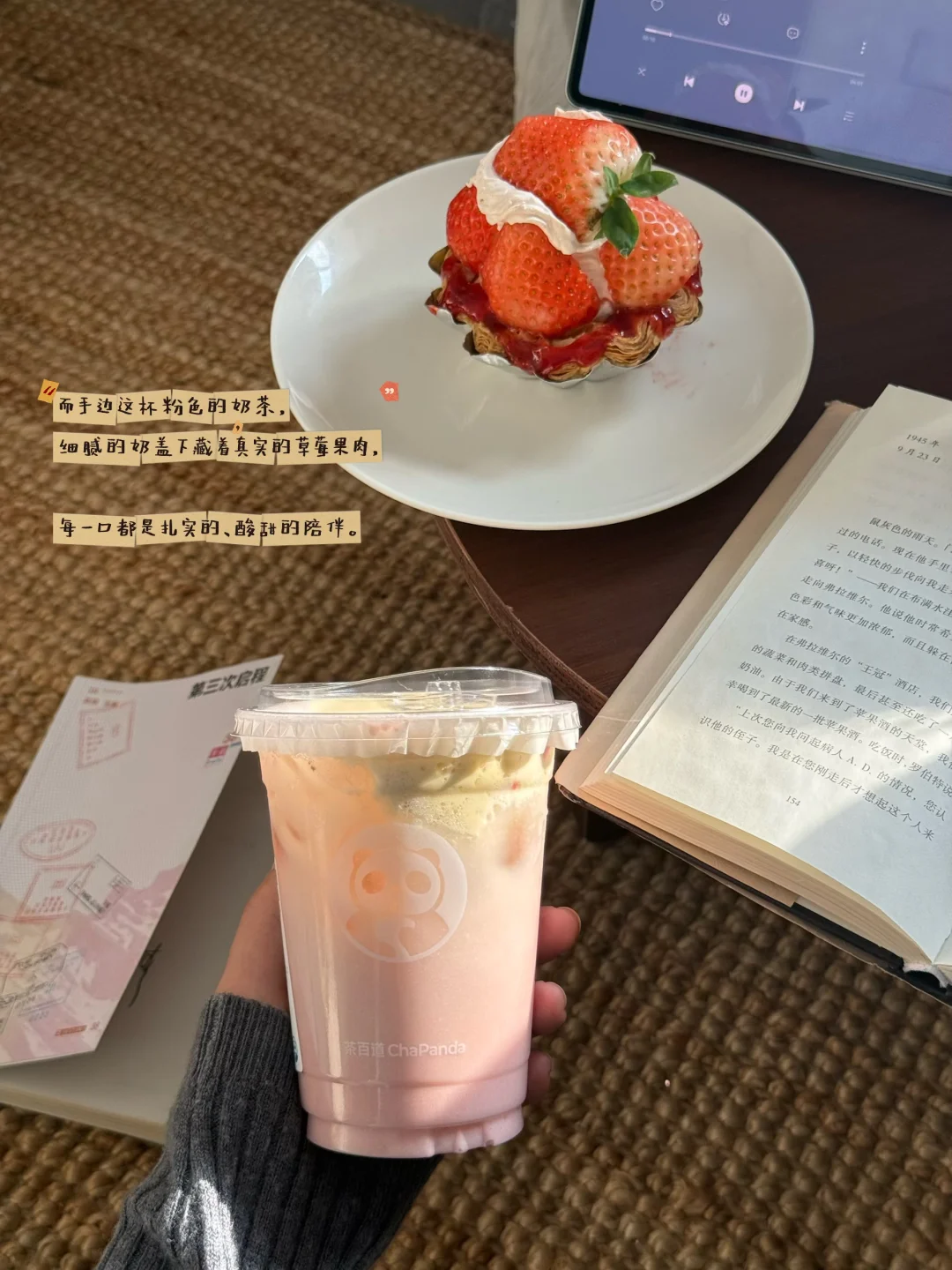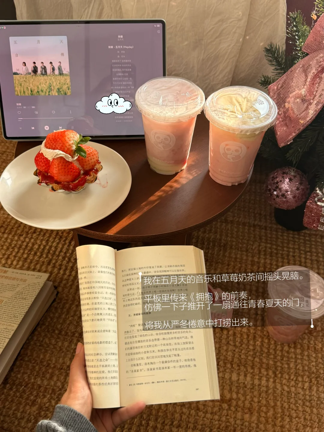 如果说冬日是凝固的、缓慢的 是窗外灰白的天和屋内昏昏欲睡的热气 那我选择用跳跃的音符与鲜红的草莓, 为自己搭建一个明亮而温暖的避难所。 我在五月天的音乐和草莓奶茶间摇头晃脑。 平板里传来《拥抱》的前奏,仿佛一下子推开了一扇通往青春夏天的门,将我从严冬倦意中打捞出来。 而手边这杯粉色的奶茶,细腻的奶盖下藏着真实的草莓果肉,每一口都是扎实的、酸甜的陪伴。 -