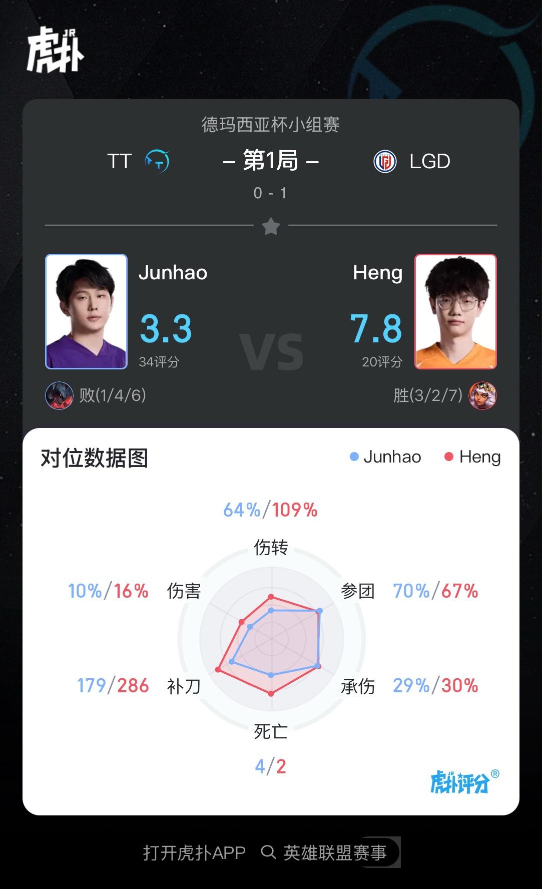 Heng使用奇亚娜打出3/2/7战绩,斩获LGD对阵TT第一局MVP
