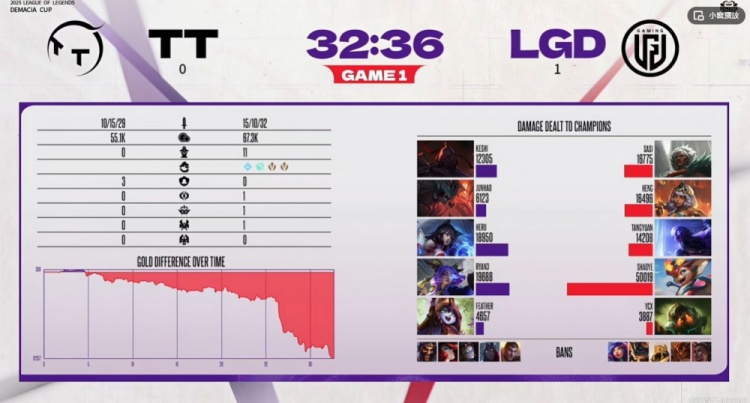 21分钟上路团战留人的Heng猴子倒下,但是Tangyuan岩雀闪现抬配合sasi乌迪尔开圈还是随便追击!LGD打出1换3之后回头拿下厄塔汗!5K经济差!25分钟LGD连续找到机会击杀TT中野,回头拿下大龙!28分钟LGD抱团推进,拆掉TT两路高地之后经济差已经超过一万!30分钟LGD拿下土龙魂,TT强开伤害完全不够,Shaoye女枪三杀团灭!LGD以2-0比分击败TT!