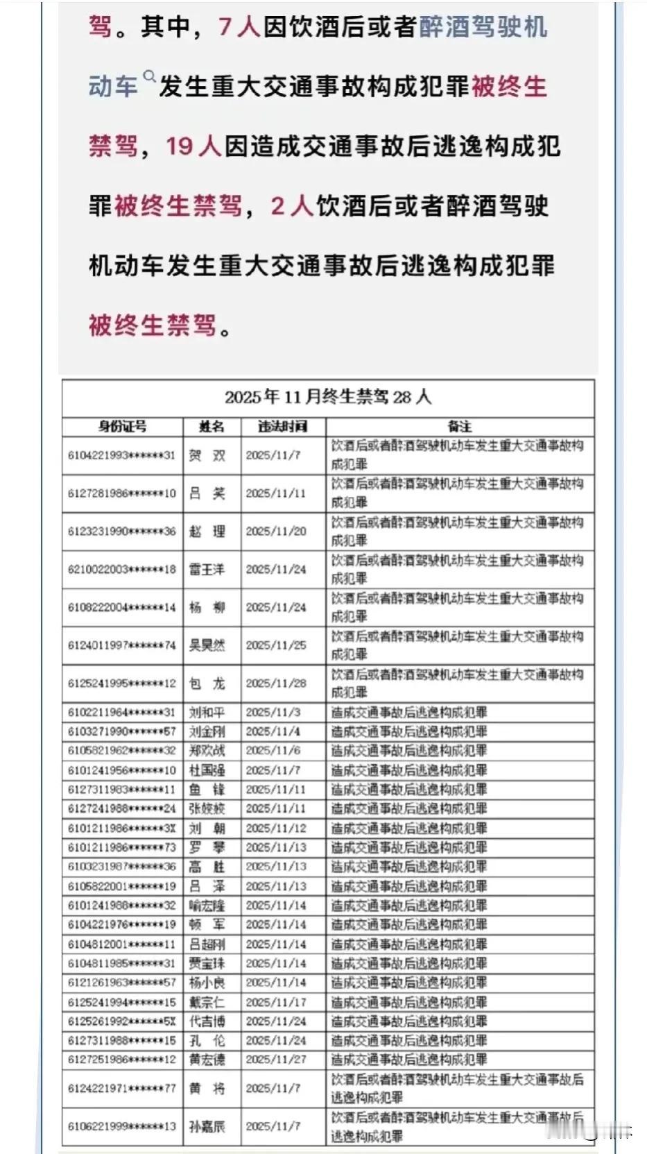 陕西28人被终生禁驾! 12月15日,陕西省公安厅交警总队曝光2025年11月份终生禁驾名单,内容如下。