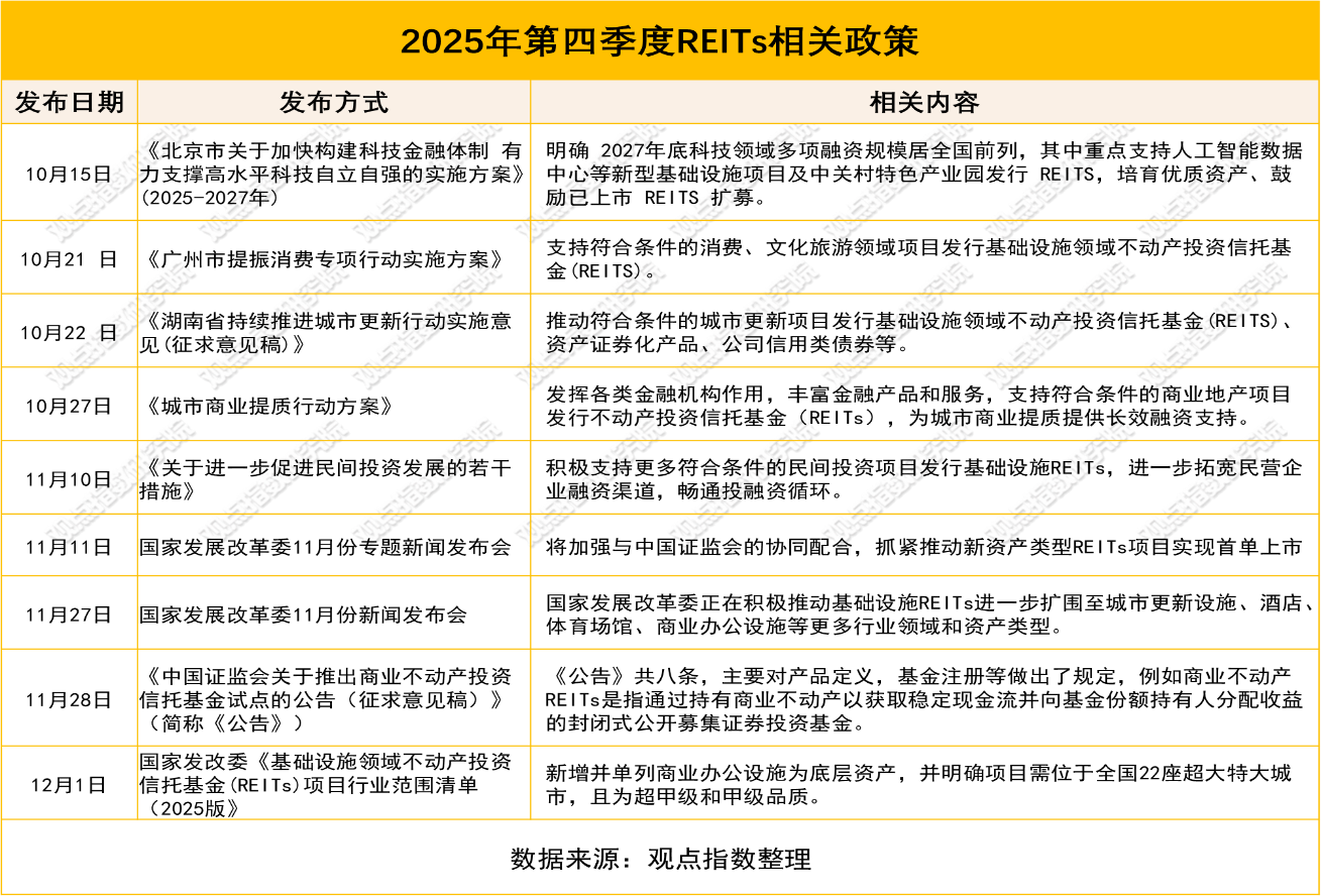 观点指数认为,此轮REITs政策的密集落地,本质是通过金融工具创新为房地产行业存量资产构建了“可盘活、可退出、可循环”的新机制。在行业调整期,这一机制不仅能缓解房企的资金压力、优化资产结构,更能推动行业从“开发销售”向“持有运营”转型,为房地产市场的长期健康发展提供金融新动能。