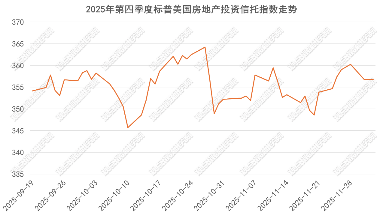 进入11月,指数再次震荡回落,11月21日降至353.82;11月下旬起逐步回升,11月26日达359.0447,12月3日收于356.76,较期初小幅上涨约0.75%。整体而言,指数在三个月内的波动区间为约16.39点(345.72-362.11),振幅约4.6%,显示市场对美国房地产投资信托的价值判断趋于谨慎,但四季度末的小幅回升反映部分资金对行业长期价值的认可,需持续关注宏观经济环境(如中美对等关税政策,利率走势、商业地产需求)对REITs的影响。